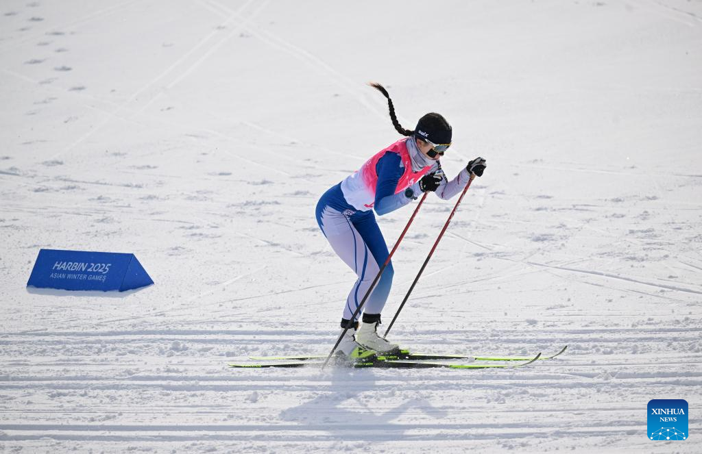 Meng Honglian of China competes during the women's sprint classic qualification match of the cross-country skiing event at the 9th Asian Winter Games in Yabuli, northeast China's Heilongjiang Province, Feb. 8, 2025. (Xinhua/Zhang Long)