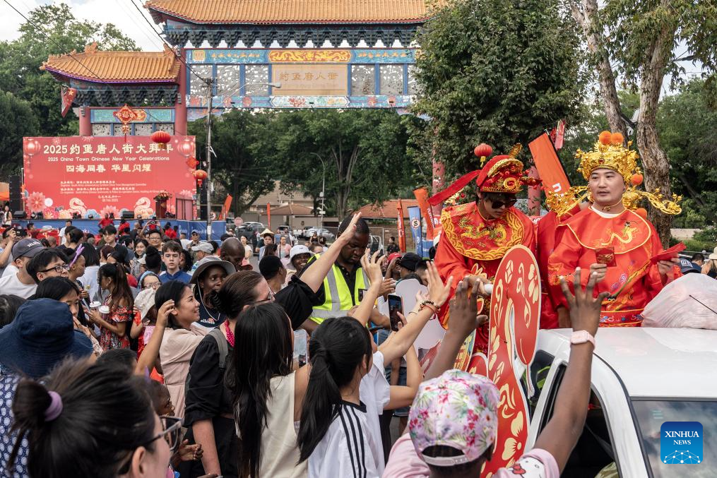 Visitors pose for photos at Johannesburg China Town during a Chinese Lunar New Year celebration in Johannesburg, South Africa, Feb. 8, 2025. (Photo by Shiraaz Mohamed/Xinhua)