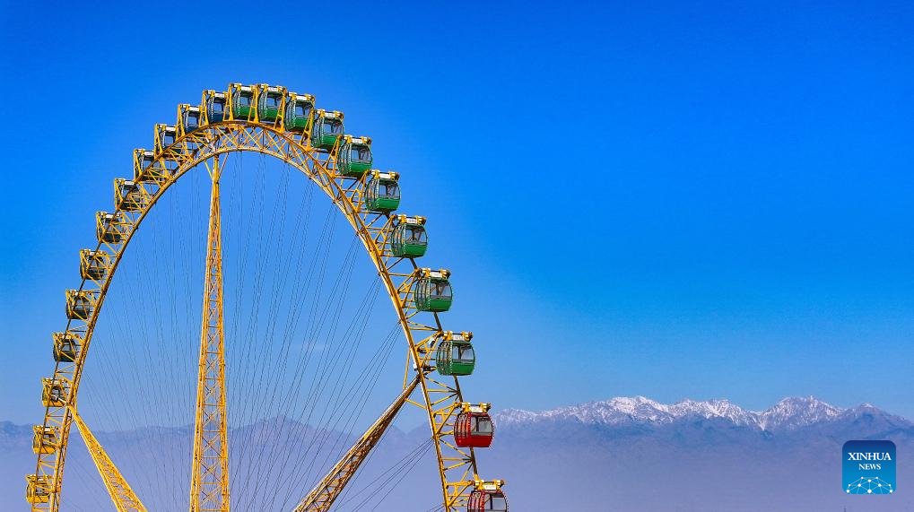 An aerial drone photo taken on Feb. 9, 2025 shows the snow-covered Helan Mountains seen from an amusement park in Yinchuan, northwest China's Ningxia Hui Autonomous Region. (Xinhua/Feng Kaihua)