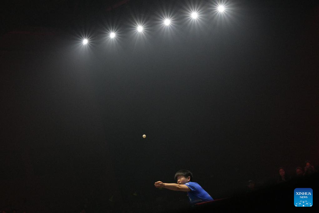 Liang Jingkun hits a return during the men's singles final between Lin Shidong of China and Liang Jingkun of China at the World Table Tennis (WTT) Singapore Smash 2025 in Singapore, Feb. 9, 2025. (Photo by Then Chih Wey/Xinhua)