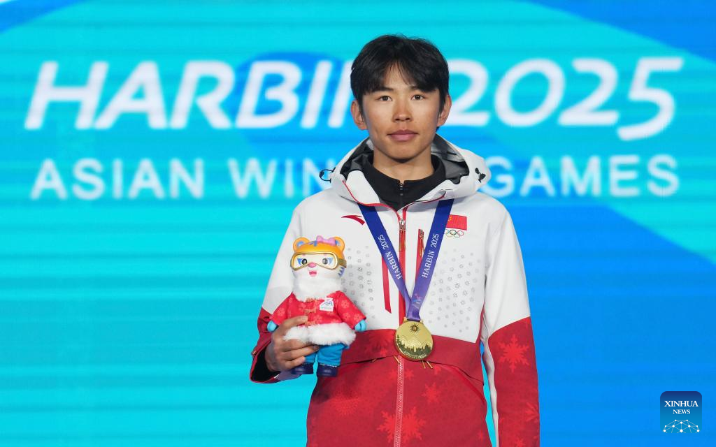 Gold medalist Buluer of China poses during the awarding ceremony after the ski mountaineering men's sprint final at the 9th Asian Winter Games in Yabuli, northeast China's Heilongjiang Province, Feb. 9, 2025. (Xinhua/Wang Song)