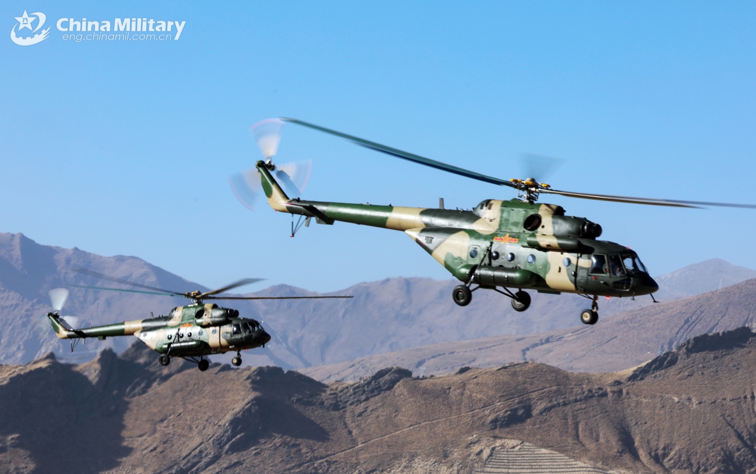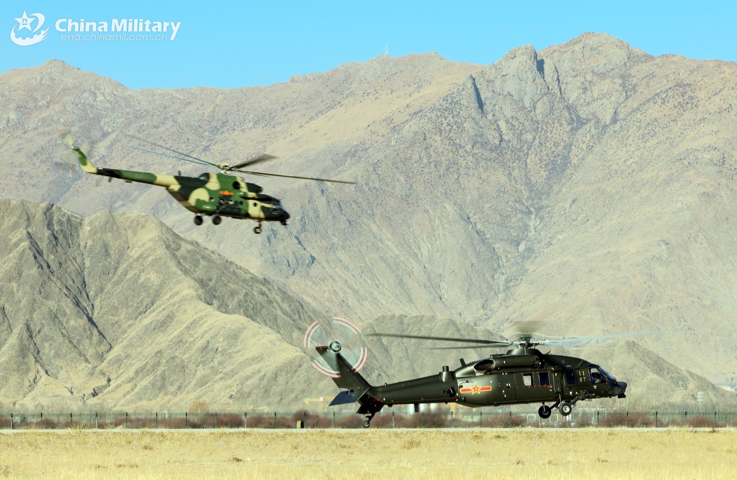 A Z-20 transport helicopter and a Mi-171 transport helicopter attached to an army aviation brigade under the Chinese PLA Xizang Military Command land during a flight training exercise in early January, 2025. (eng.chinamil.com.cn/Photo by Hu Qiwu)