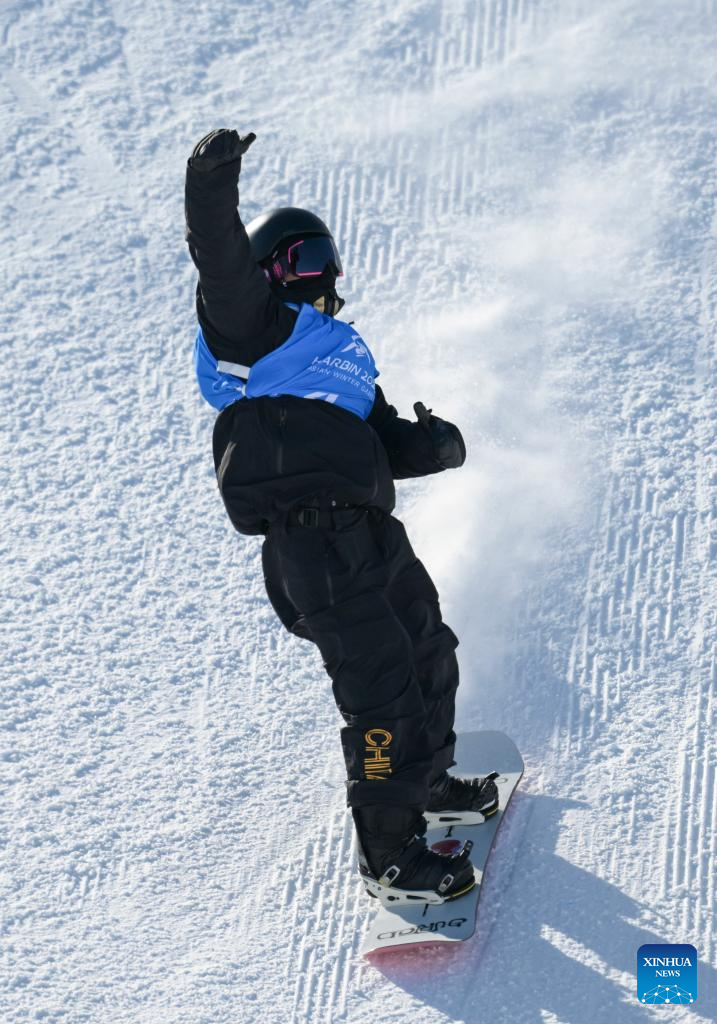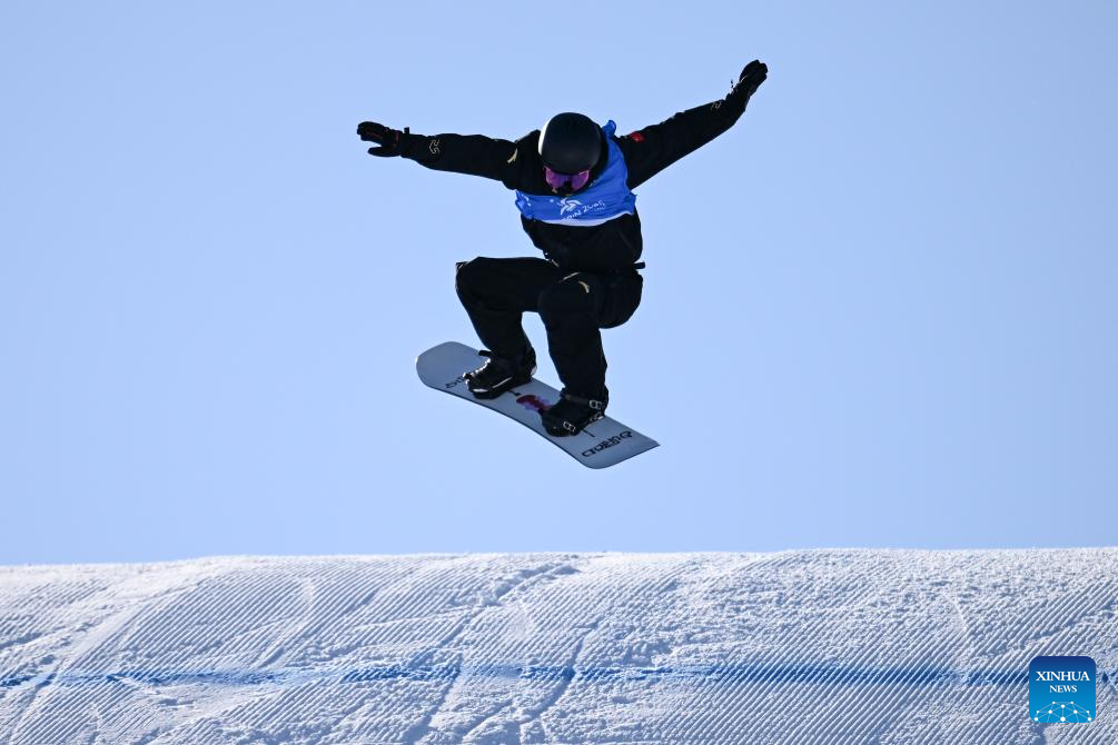 Jiang Xinjie of China competes during the men's snowboard big air final match at the 9th Asian Winter Games in Yabuli, northeast China's Heilongjiang Province, Feb. 10, 2025. (Xinhua/Mu Yu)