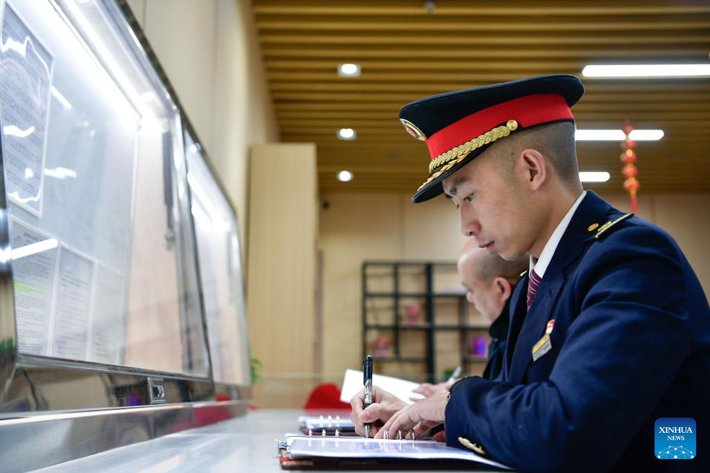 Lu Jinsheng talks with a train conductor on duty on an interphone at Guiyang north station in Guiyang, southwest China's Guizhou Province, Feb. 7, 2025. (Xinhua/Yang Wenbin)