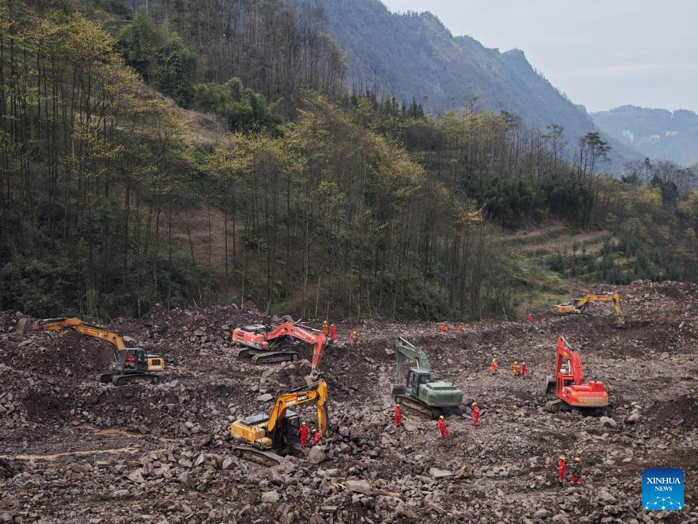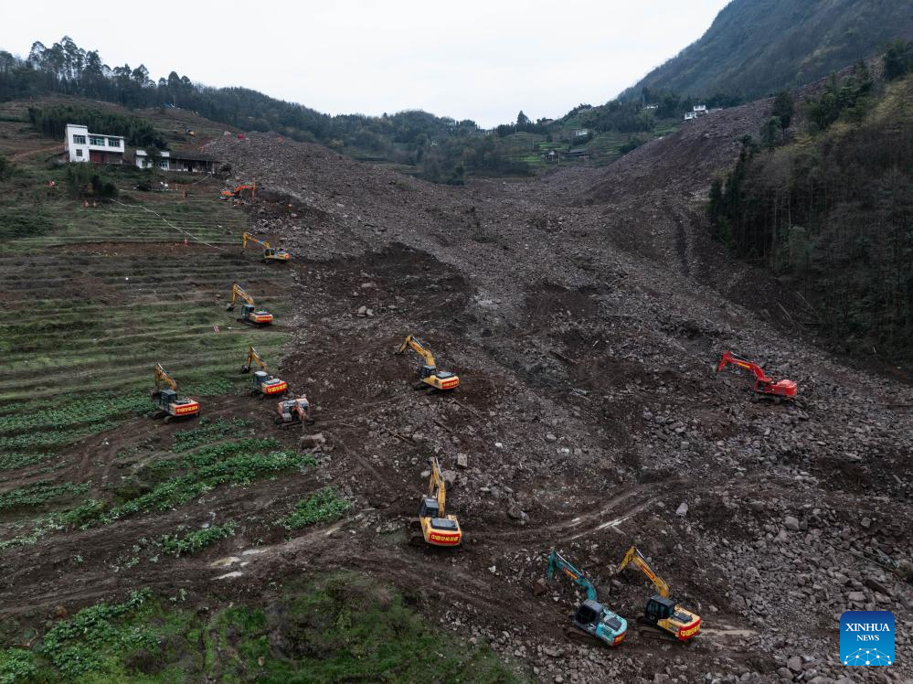 Excavators work at the rescue site in Junlian County in the city of Yibin, southwest China's Sichuan Province, Feb. 10, 2025. (Xinhua/Jiang Hongjing)