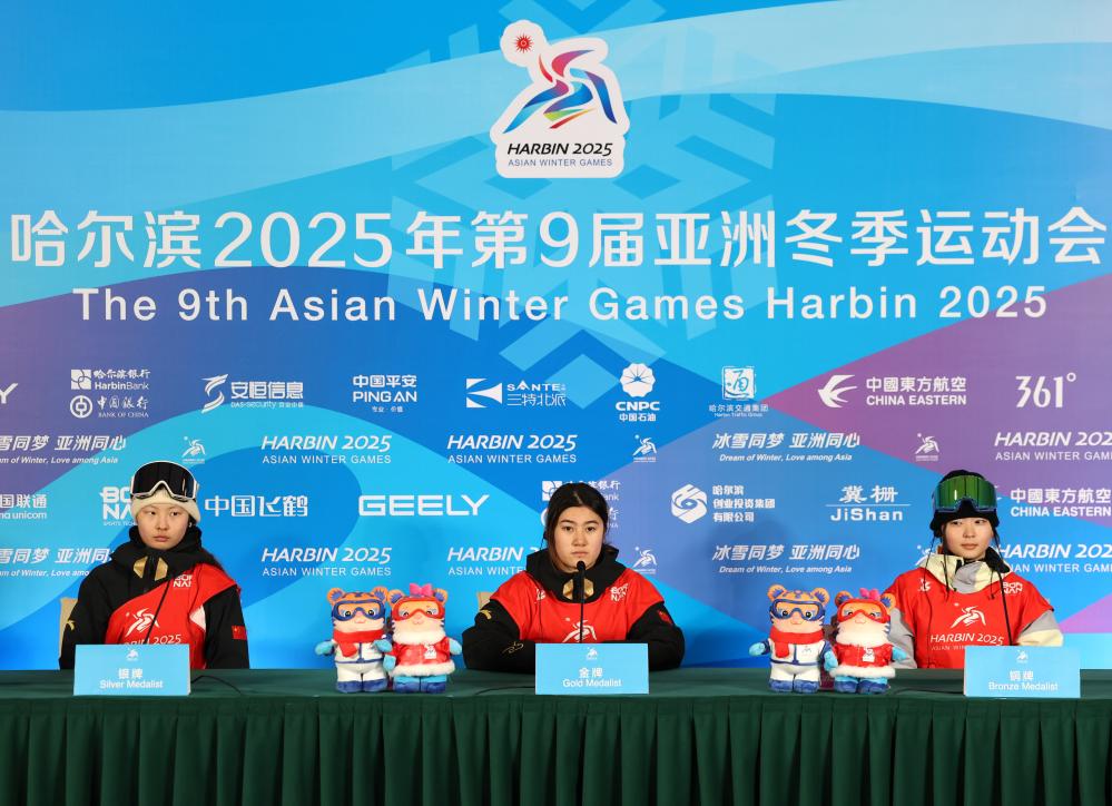Gold medalist Xiong Shirui of China attends the press conference after the women's snowboard big air final match at the 9th Asian Winter Games in Yabuli, northeast China's Heilongjiang Province, Feb. 10, 2025. (Xinhua/Zhang Chenlin)