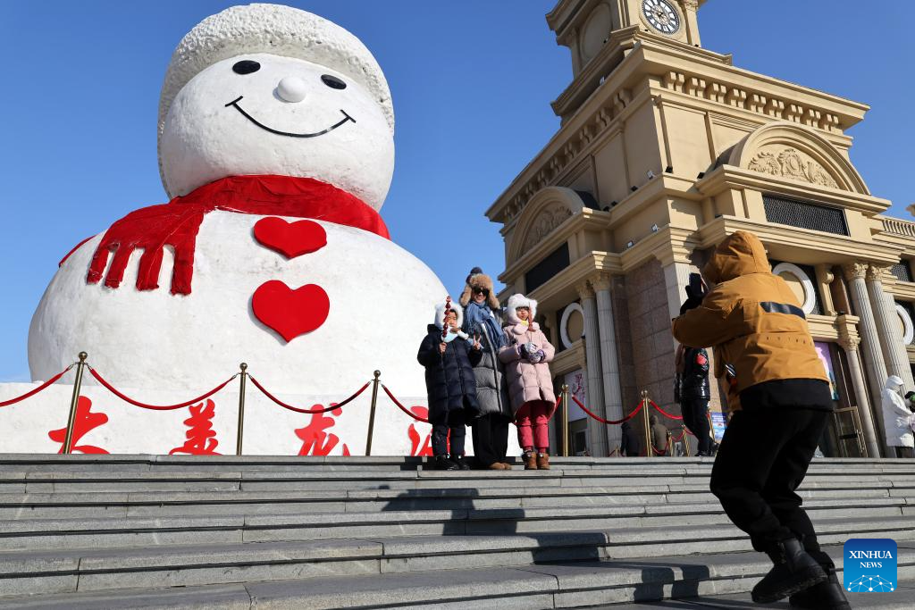 Tourists take photos in front of a giant snowman near the Qunli Music Park in Harbin, northeast China's Heilongjiang Province, Feb. 9, 2025. With the 9th Asian Winter Games underway, Harbin is attracting numerous domestic and international visitors to enjoy the beauty of winter scenery. (Xinhua/Hou Jun)