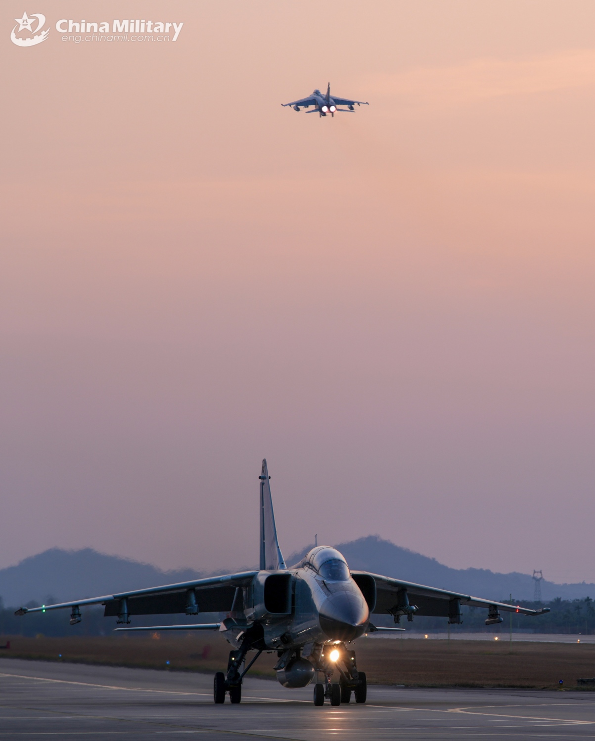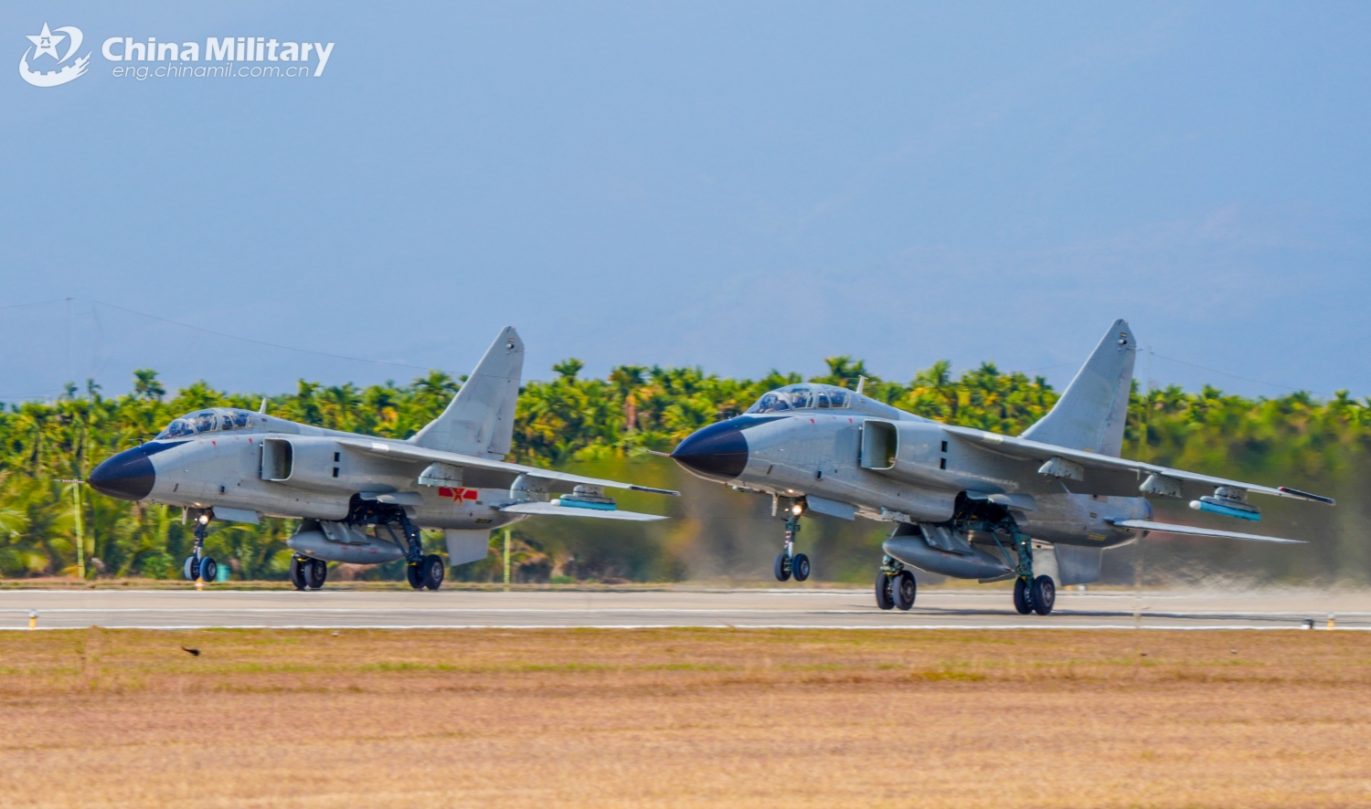 A JH-7 fighter jet attached to an aviation brigade with the air force under the Chinese PLA Southern Theater Command takes off for a round-the-clock flight training exercise on January 21, 2025. (eng.chinamil.com.cn/Photo by Jiang Guangzhen)