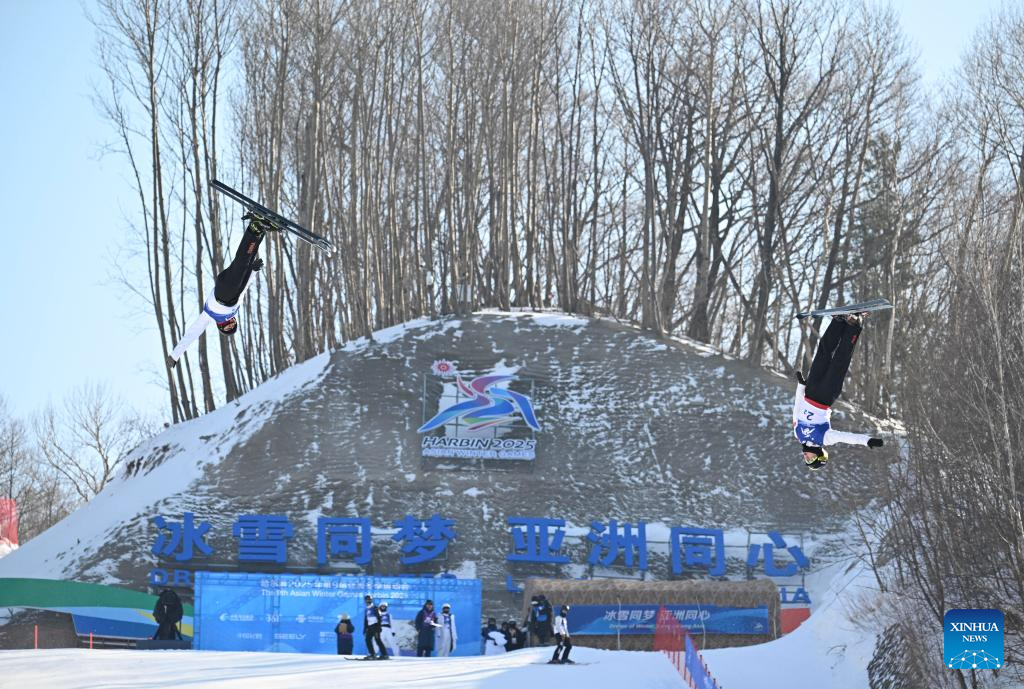 Li Xinpeng (L)/Qi Guangpu of China compete during the Freestyle Skiing men's aerials synchro final at the 9th Asian Winter Games in Yabuli, northeast China's Heilongjiang Province, Feb. 11, 2025. (Xinhua/Zhang Chenlin)