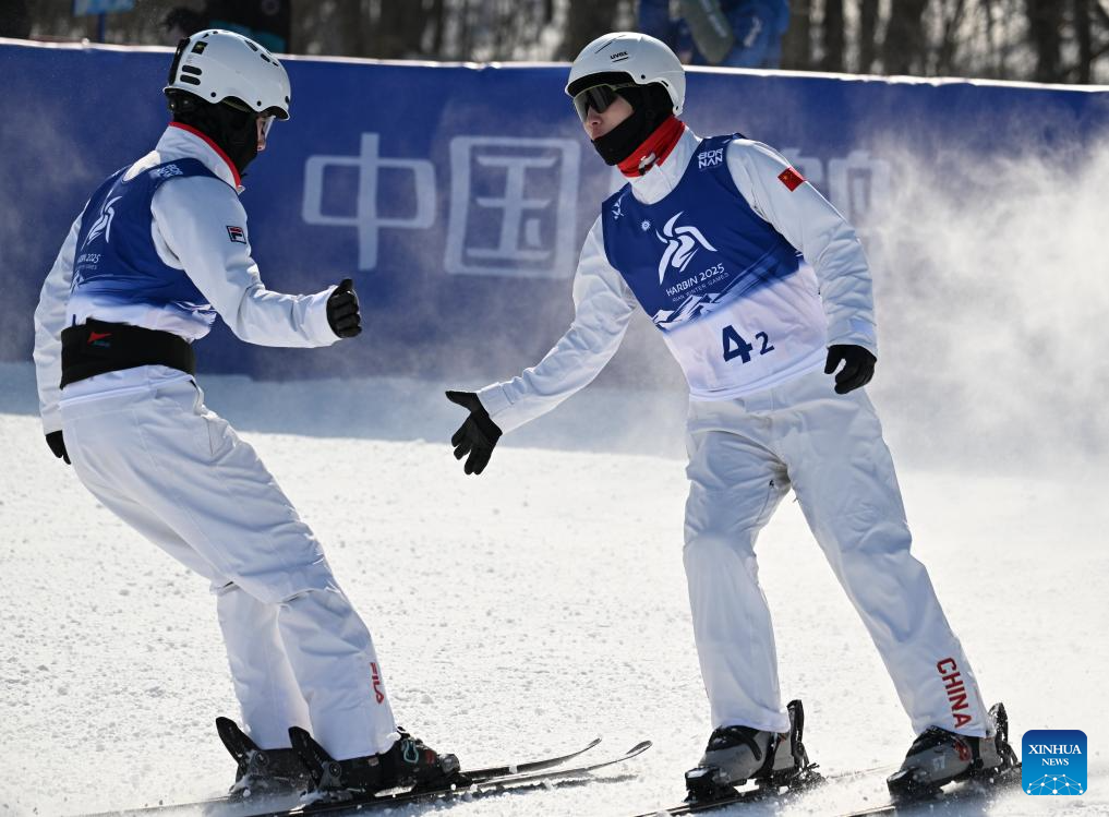 Geng Hu (R)/Yang Yuheng of China compete during the Freestyle Skiing men's aerials synchro final at the 9th Asian Winter Games in Yabuli, northeast China's Heilongjiang Province, Feb. 11, 2025. (Xinhua/Xia Yifang)