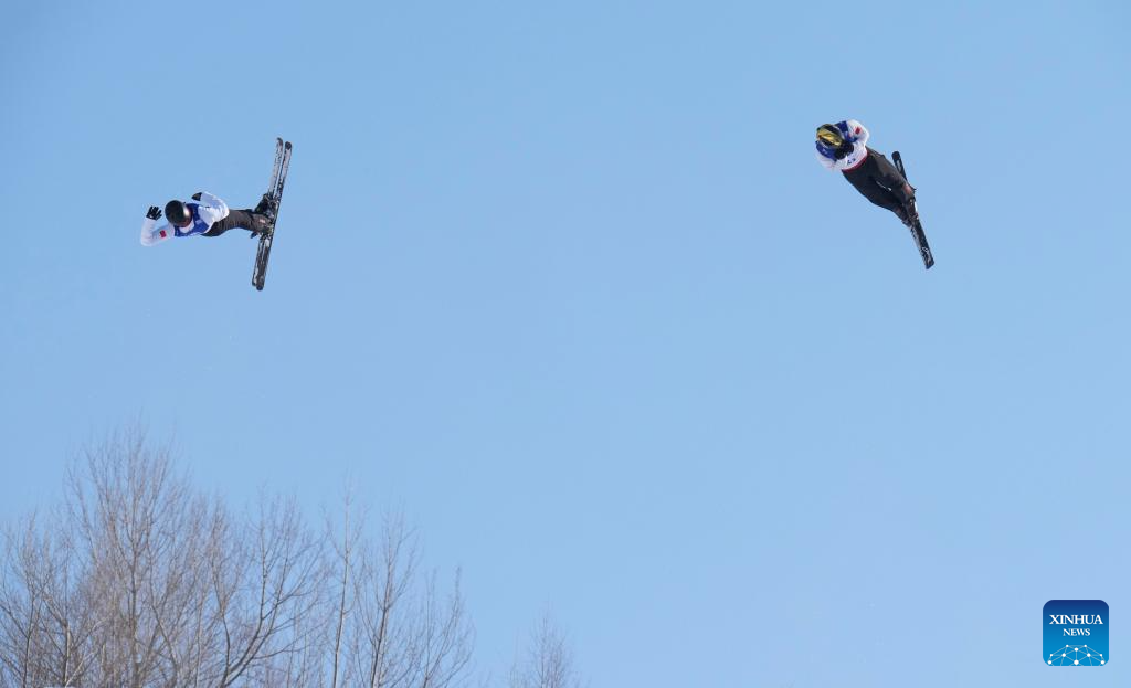 Li Xinpeng (L)/Qi Guangpu of China compete during the Freestyle Skiing men's aerials synchro final at the 9th Asian Winter Games in Yabuli, northeast China's Heilongjiang Province, Feb. 11, 2025. (Xinhua/Wang Song)
