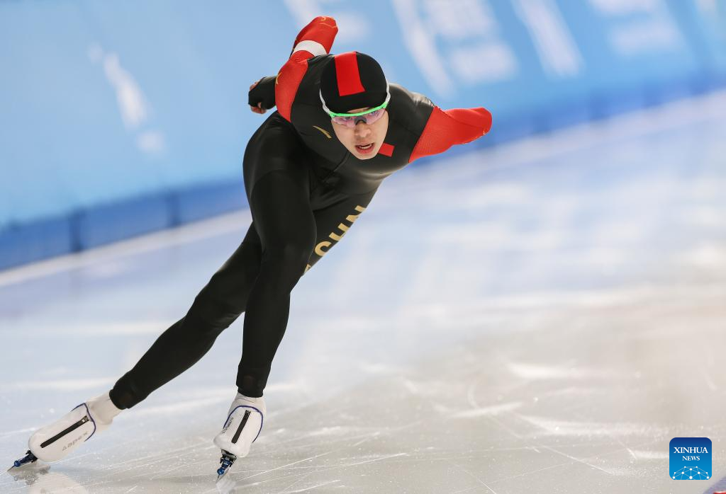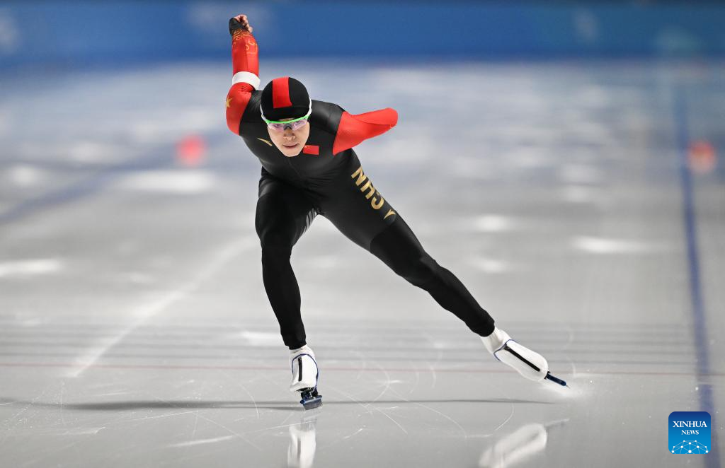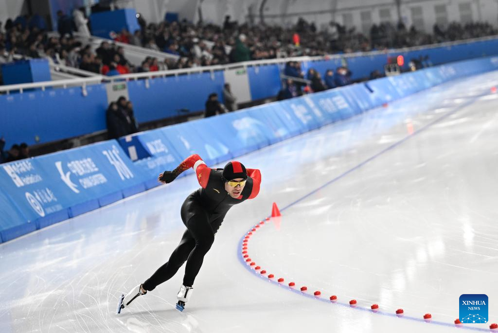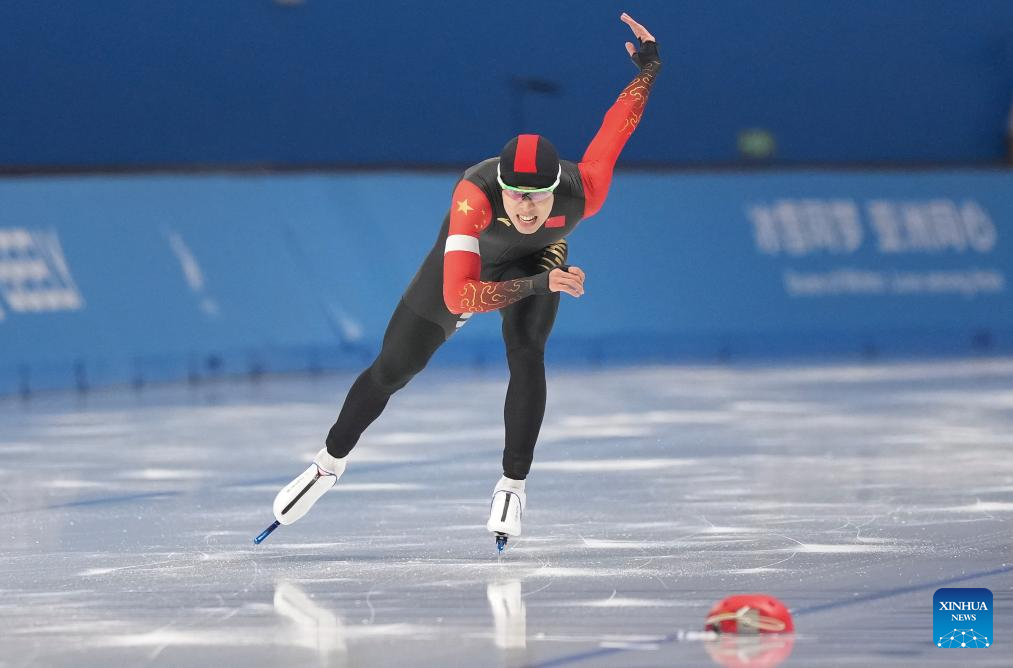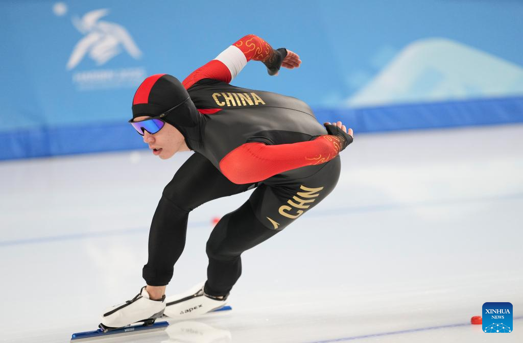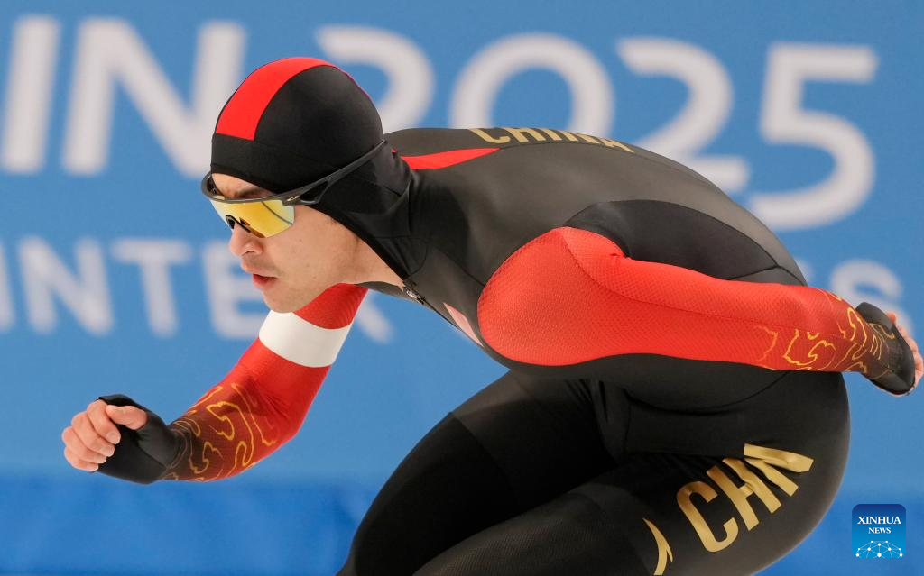 Lian Ziwen of China competes during the men's 1000m final match of the speed skating event at the 9th Asian Winter Games in Harbin, northeast China's Heilongjiang Province, Feb. 11, 2025. (Xinhua/Wang Kaiyan)