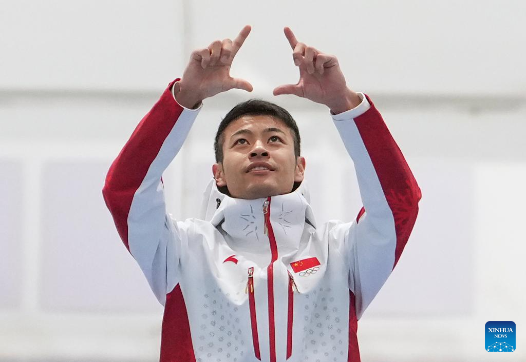 Lian Ziwen of China celebrates after the men's 1000m final match of the speed skating event at the 9th Asian Winter Games in Harbin, northeast China's Heilongjiang Province, Feb. 11, 2025. (Xinhua/Wang Xi)