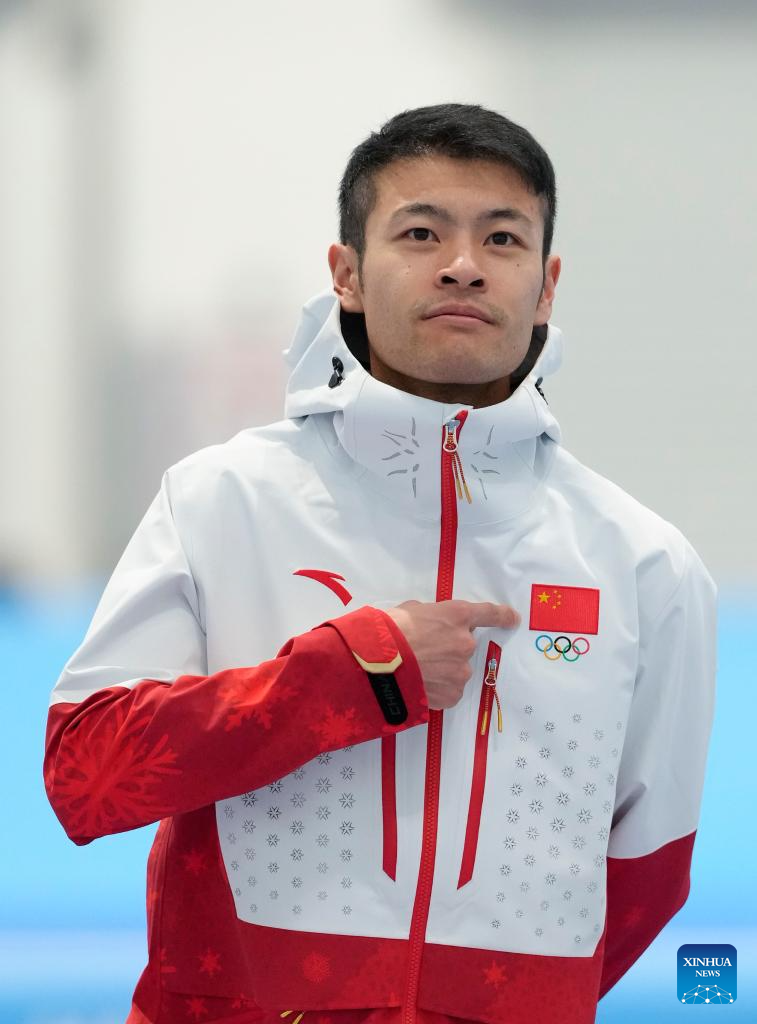 Ning Zhongyan of China reacts during the men's 1000m final match of the speed skating event at the 9th Asian Winter Games in Harbin, northeast China's Heilongjiang Province, Feb. 11, 2025. (Xinhua/Chen Zhenhai)