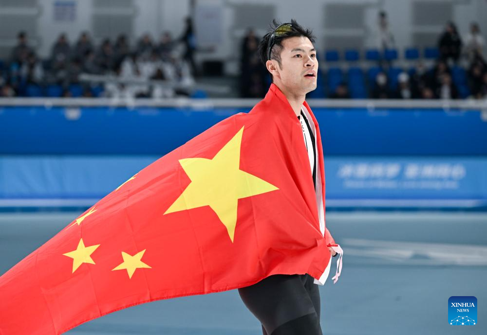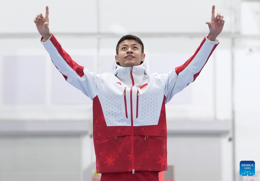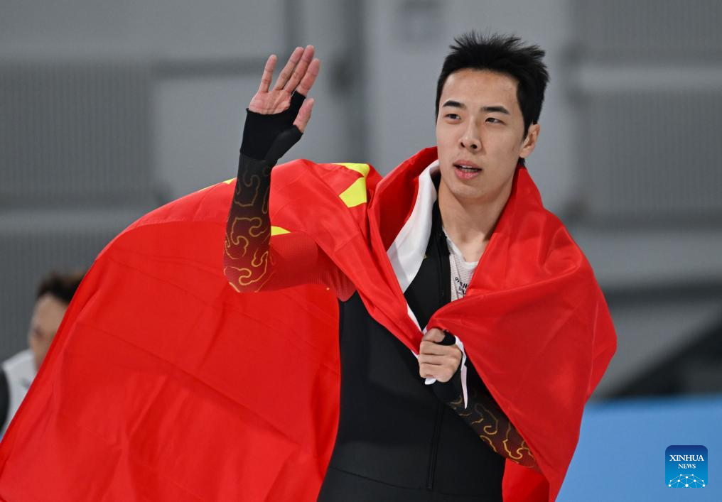 Ning Zhongyan of China celebrates during the men's 1000m final match of the speed skating event at the 9th Asian Winter Games in Harbin, northeast China's Heilongjiang Province, Feb. 11, 2025. (Xinhua/Chen Zhenhai)