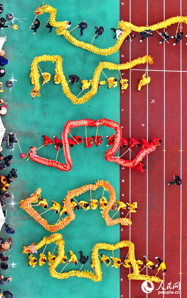 A traditional dragon dance performance captivates spectators in Zhangjiashan subdistrict, Zhangshu city, east China's Jiangxi Province, Feb. 10, 2025. (People's Daily Online/Zhu Haipeng)