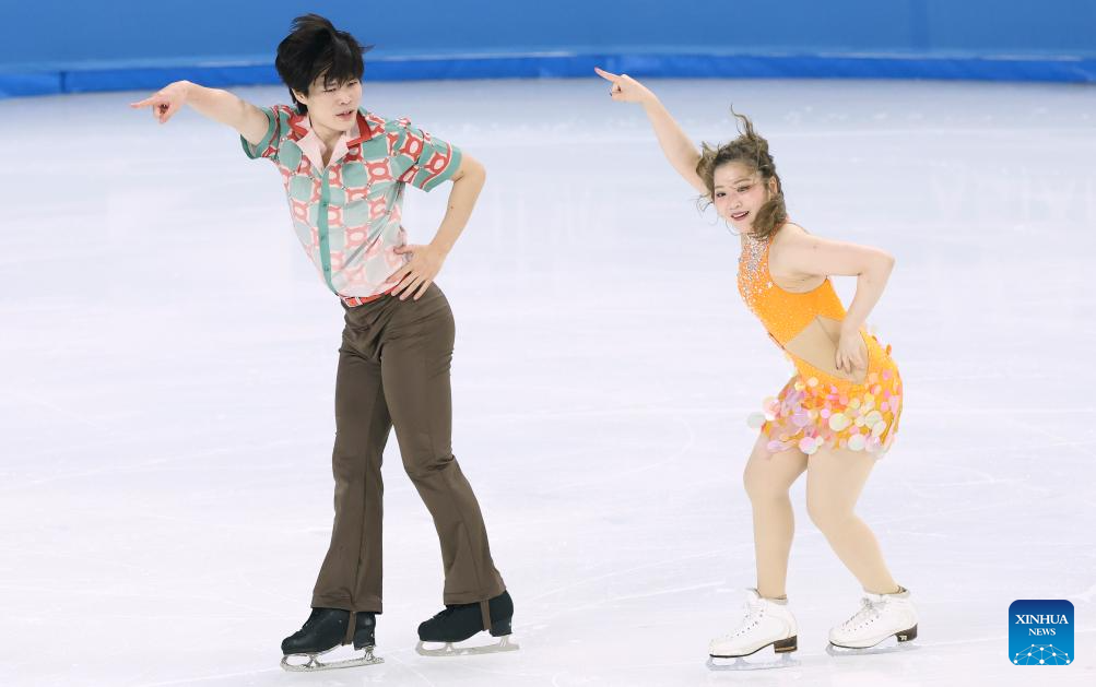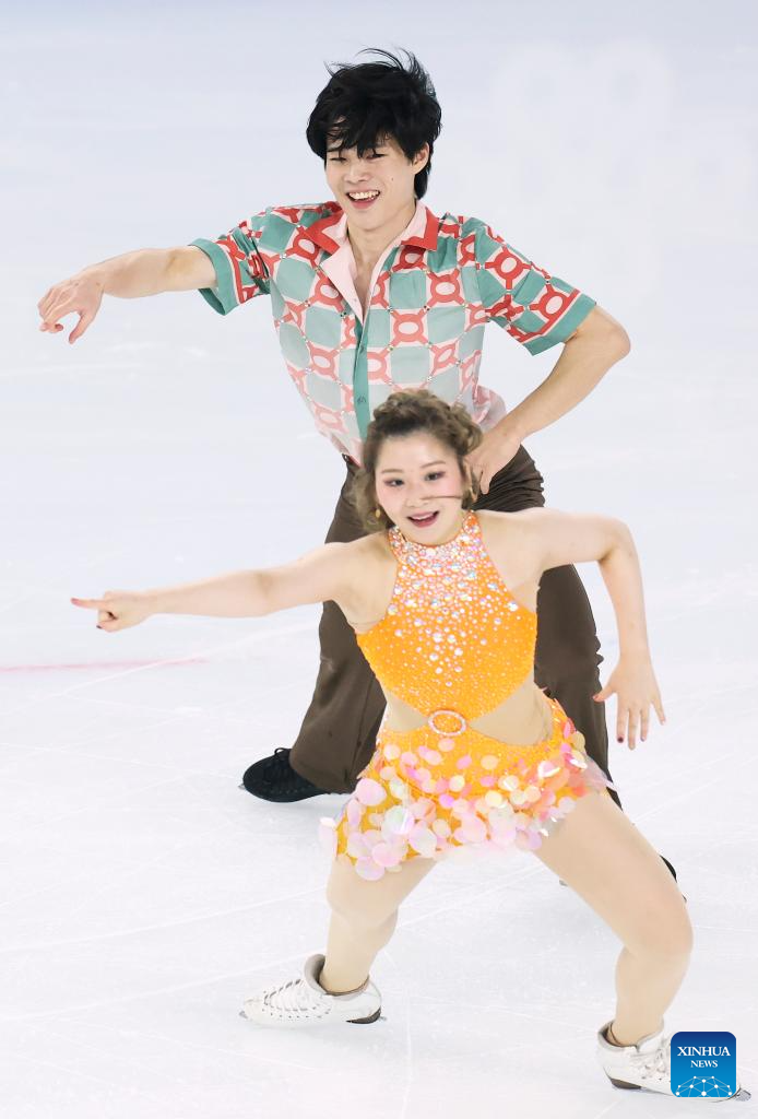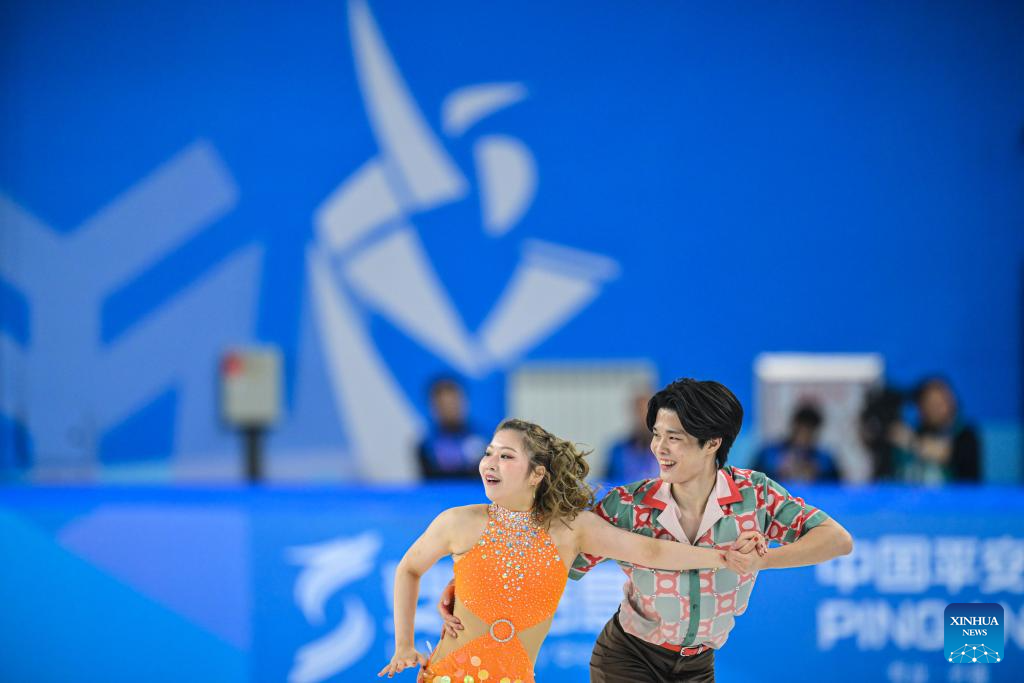 Tanaka Azusa(L)/Nishiyama Shingo of Japan perform during the ice dance rhythm dance of the figure skating event at the 9th Asian Winter Games in Harbin, northeast China's Heilongjiang Province, Feb. 11, 2025. (Xinhua/Jiang Han)