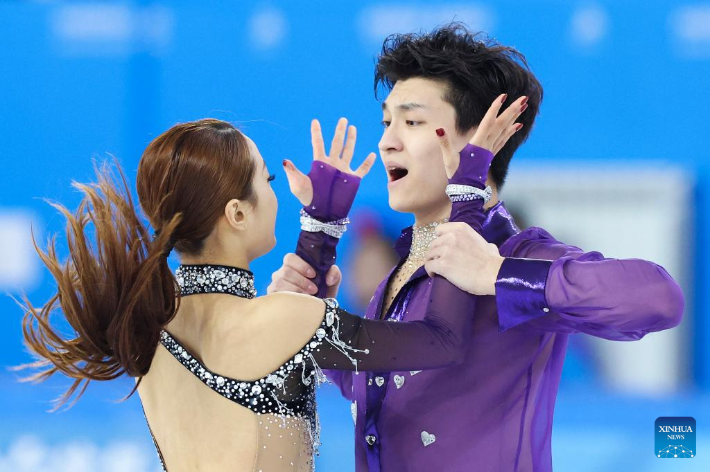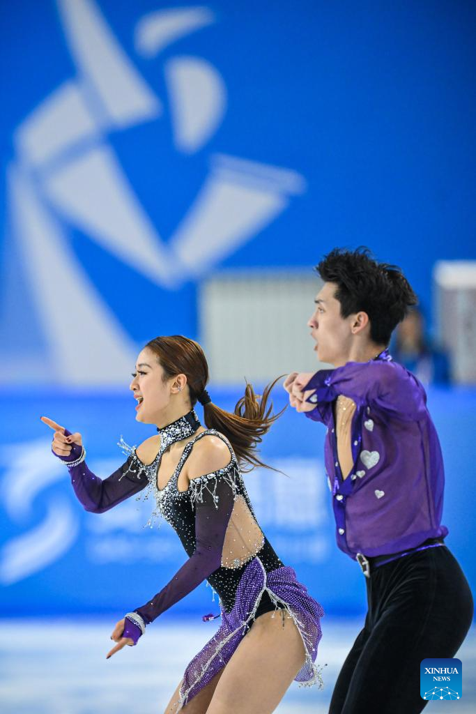Ren Junfei (L) and Xing Jianing of China perform during the ice dance rhythm dance of the figure skating event at the 9th Asian Winter Games in Harbin, northeast China's Heilongjiang Province, Feb. 11, 2025. (Xinhua/Lai Xiangdong)