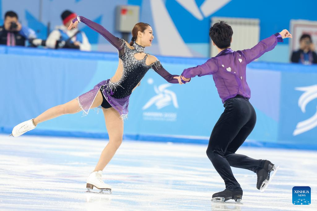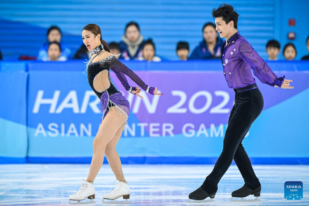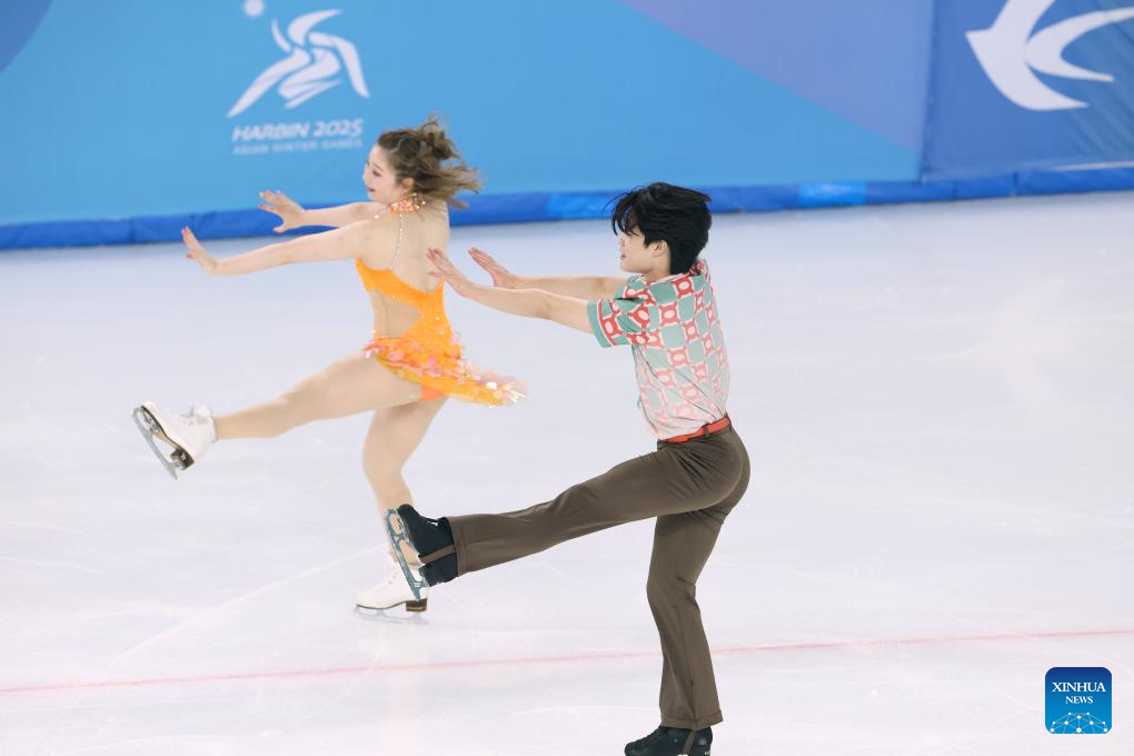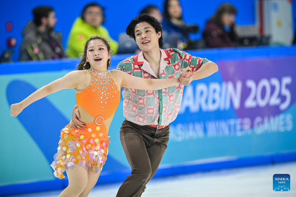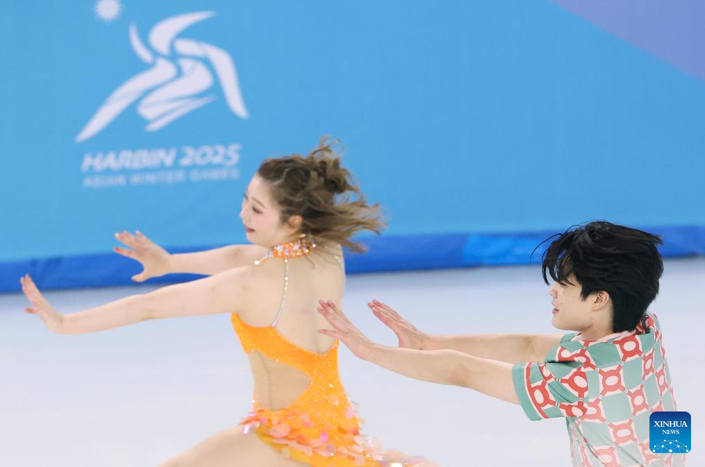 Tanaka Azusa(L)/Nishiyama Shingo of Japan perform during the ice dance rhythm dance of the figure skating event at the 9th Asian Winter Games in Harbin, northeast China's Heilongjiang Province, Feb. 11, 2025. (Xinhua/Lai Xiangdong)