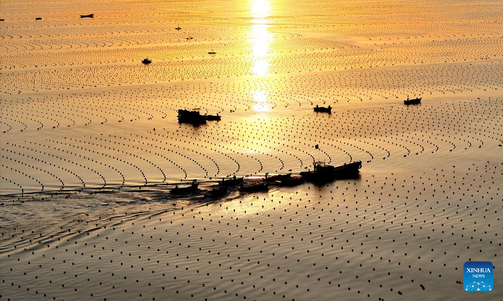 An aerial drone photo taken on Feb. 11, 2025 shows fishermen working at the kelp breeding area in Rongcheng City, east China's Shandong Province. (Photo by Yang Zhili/Xinhua)