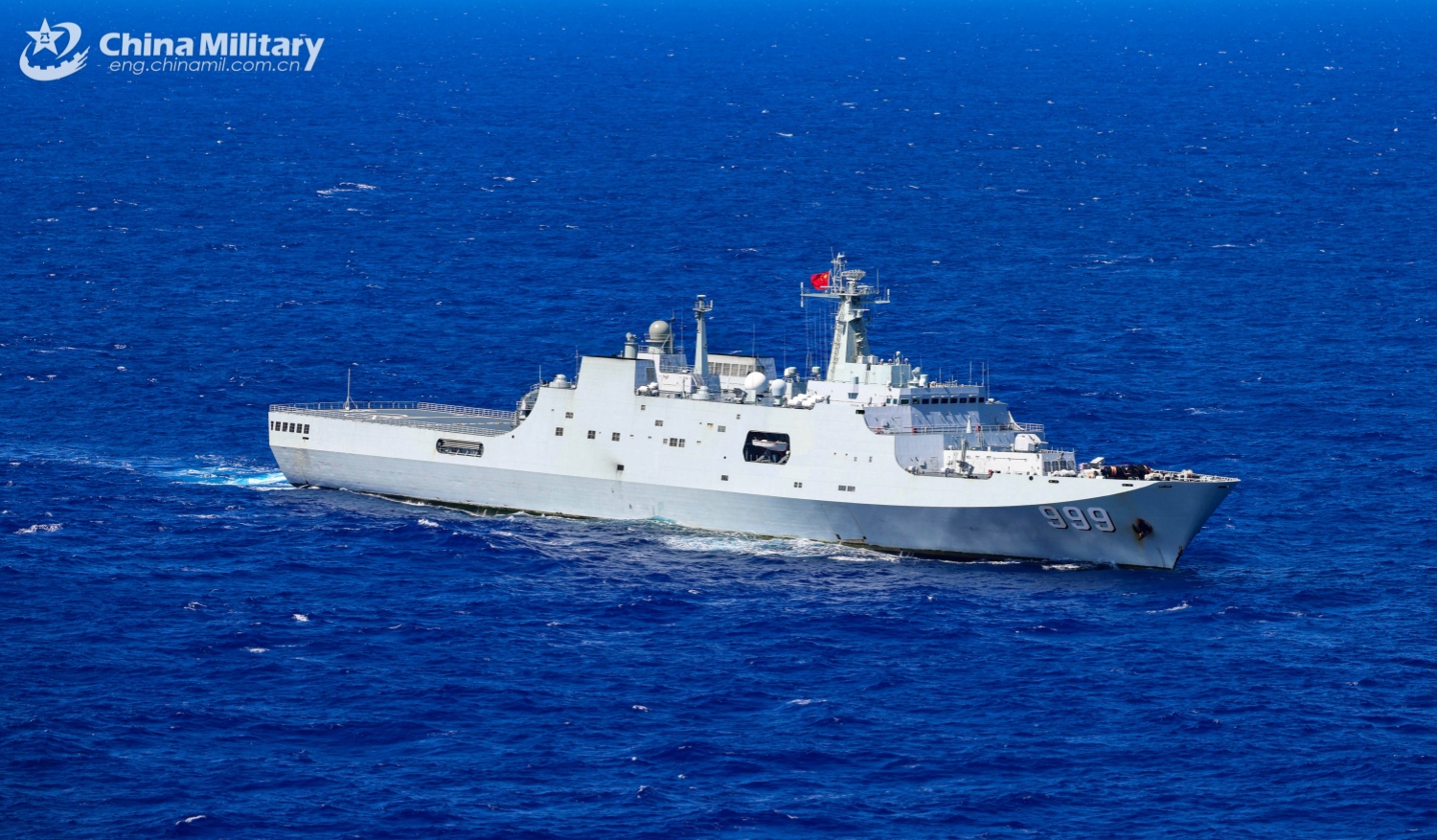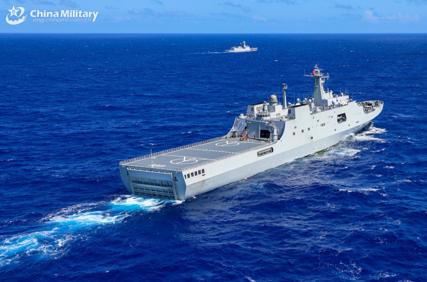The amphibious dock landing ship Jinggangshan (Hull 999) attached to a navy flotilla under the Chinese PLA Southern Theater Command sails toward the designated area for maritime training in early January 2025. (eng.chinamil.com.cn/Photo by Qiao Chenxi)