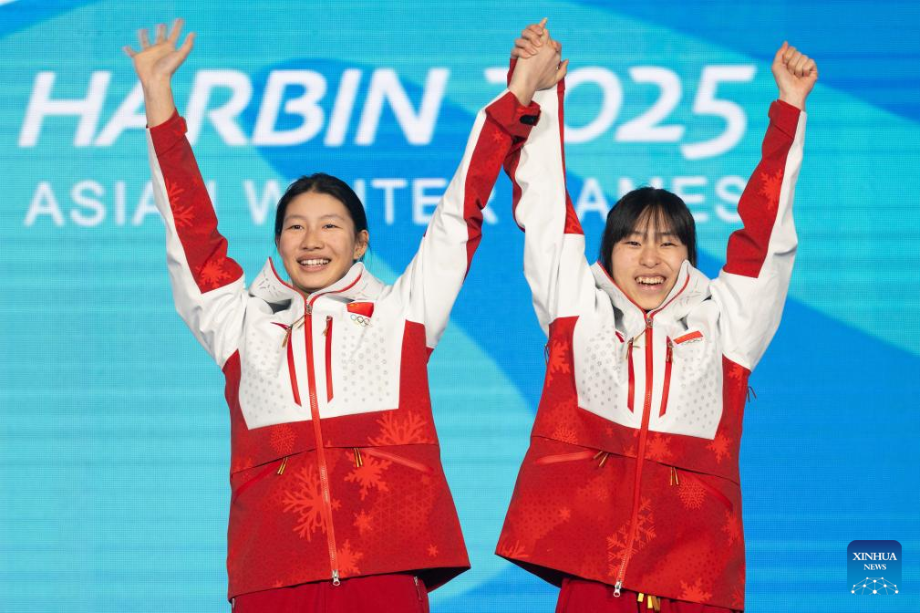 Gold medalists Feng Junxi (L)/Wang Xue of China react during the awarding ceremony for the freestyle skiing women's aerials synchro final at the 9th Asian Winter Games in Yabuli, northeast China's Heilongjiang Province, Feb. 11, 2025. (Xinhua/Xie Jianfei)