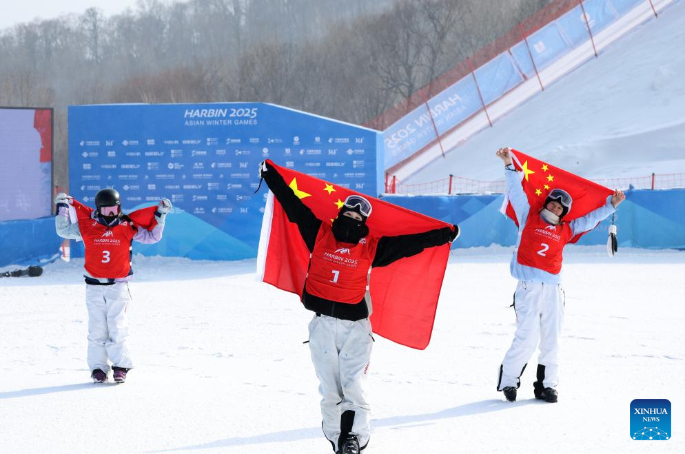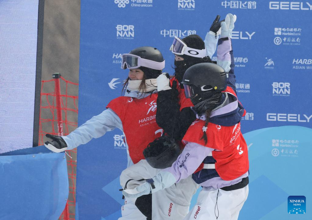 Han Linshan (R), Liu Mengting (C) and Yang Ruyi of China celebrate after the Freestyle Skiing women's freeski big air final match at the 9th Asian Winter Games in Yabuli, northeast China's Heilongjiang Province, Feb. 12, 2025. (Xinhua/Zhang Chenlin)