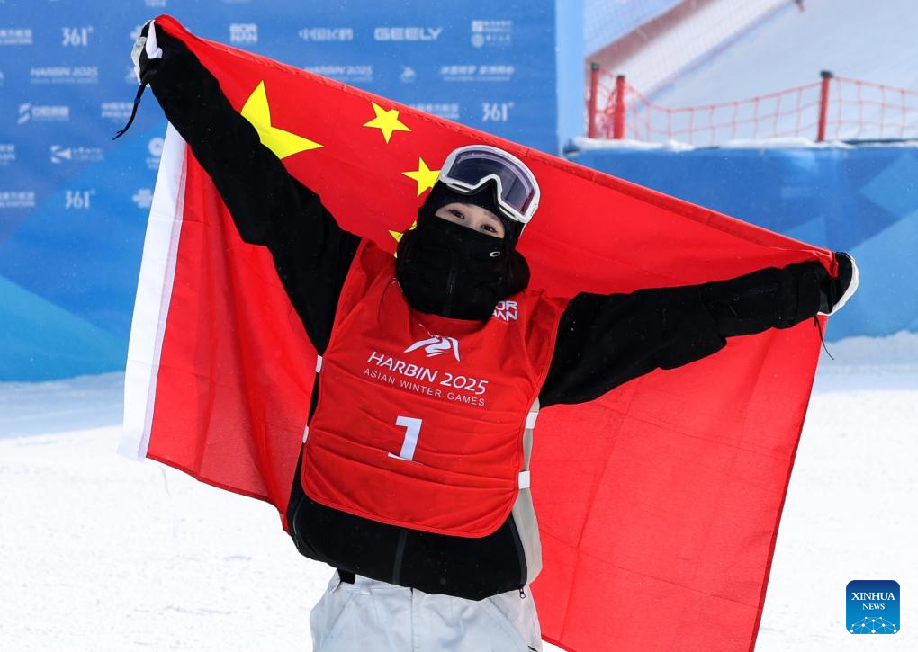 Liu Mengting of China celebrates after the Freestyle Skiing women's freeski big air final match at the 9th Asian Winter Games in Yabuli, northeast China's Heilongjiang Province, Feb. 12, 2025. (Xinhua/Zhang Chenlin)