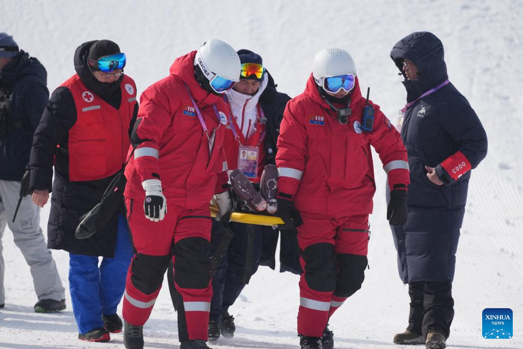 Kondo Kanon of Japan is carried down by medical staff during the Freestyle Skiing women's freeski big air final match at the 9th Asian Winter Games in Yabuli, northeast China's Heilongjiang Province, Feb. 12, 2025. (Xinhua/Wang Song)