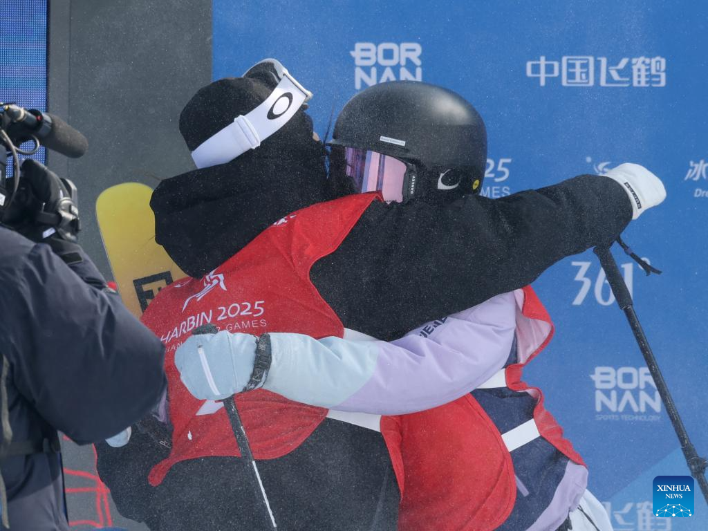 Han Linshan (R) of China hugs her teammate Liu Mengting during the Freestyle Skiing women's freeski big air final match at the 9th Asian Winter Games in Yabuli, northeast China's Heilongjiang Province, Feb. 12, 2025. (Xinhua/Zhang Chenlin)