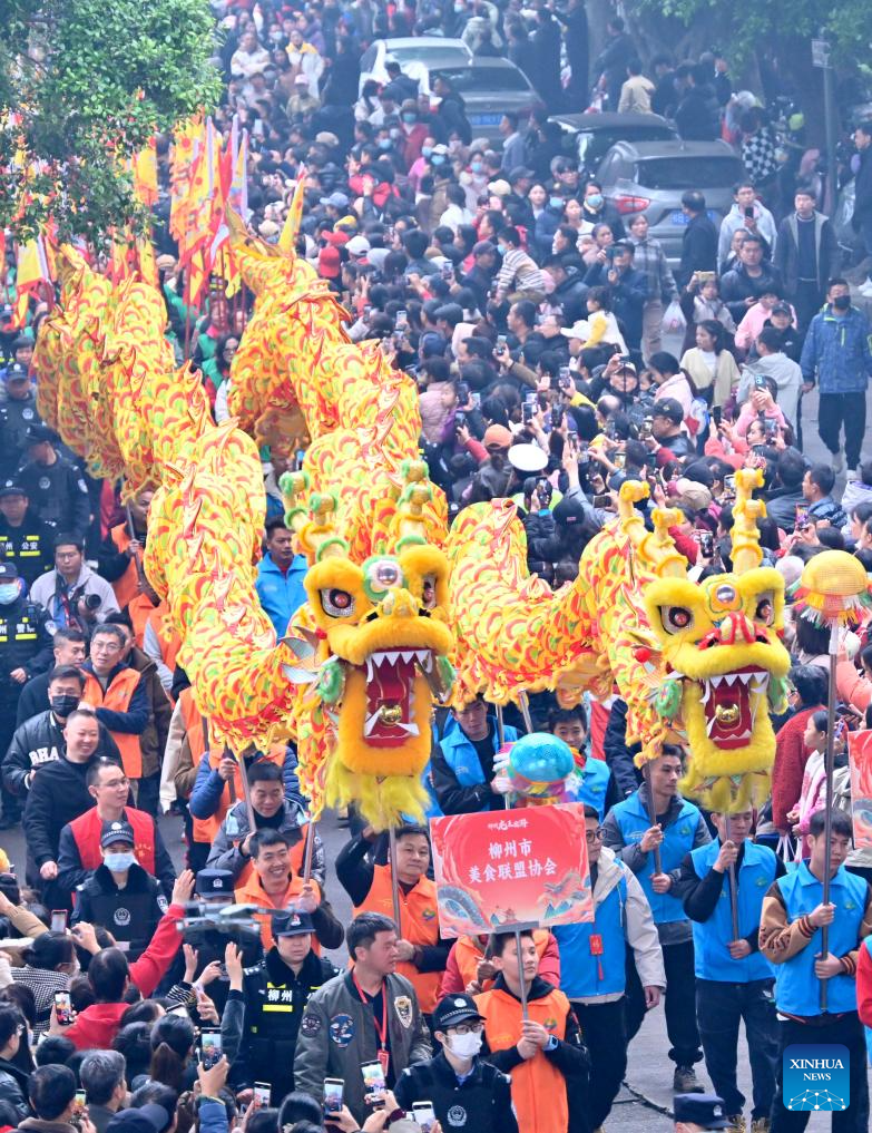 People watch dragon dance parade in Liuzhou City, south China's Guangxi Zhuang Autonomous Region, Feb. 12, 2025. Various activities were held across China to celebrate the Lantern Festival, which falls on the fifteenth day of the first month of the Chinese lunar calendar. (Photo by Li Hanchi/Xinhua)