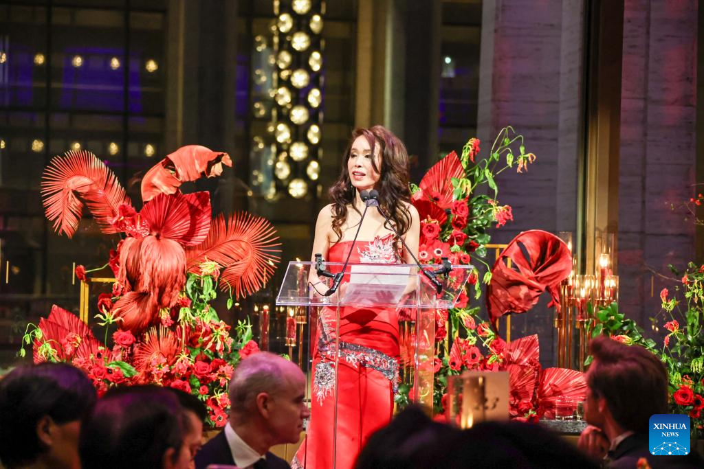 Philanthropist Angela Chen speaks at a gala following a concert celebrating the Spring Festival by the New York Philharmonic in New York City, the United States, Feb. 11, 2025. (Photo by Winston Zhou/Xinhua)