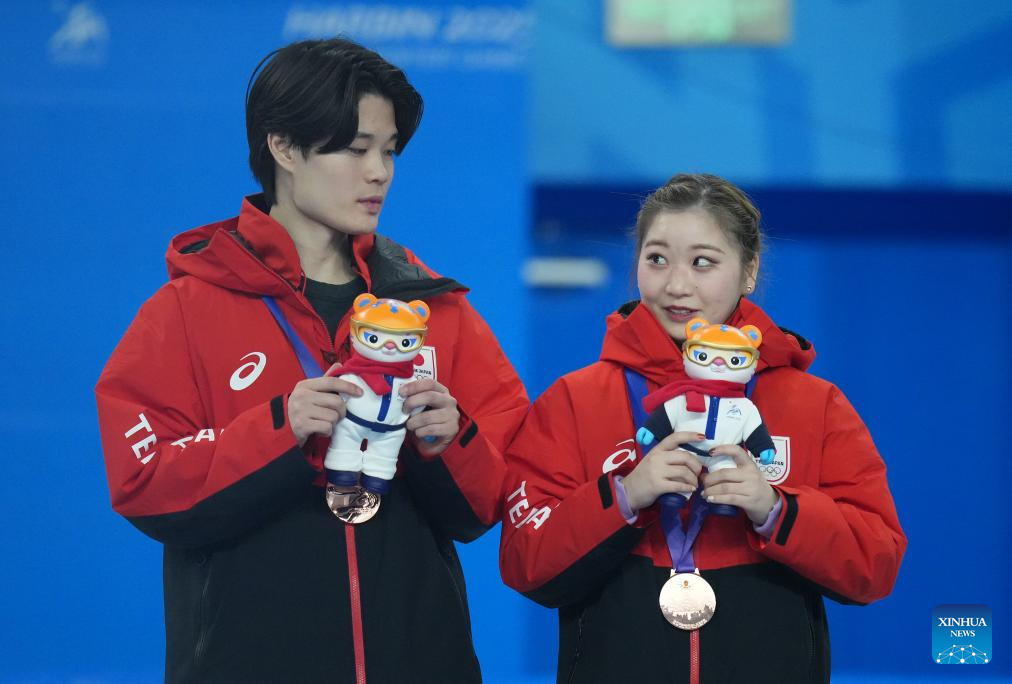 Bronze medalists Tanaka Azusa (R)/Nishiyama Shingo of Japan attend the awarding ceremony for the ice dance of figure skating event at the 9th Asian Winter Games in Harbin, northeast China's Heilongjiang Province, Feb. 12, 2025. (Xinhua/Yan Linyun)