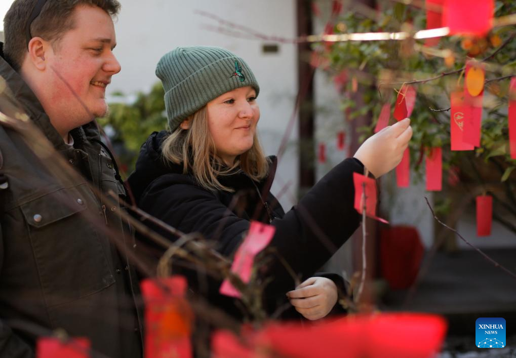 A woman ties a wish note to a tree during a community event celebrating the Lantern Festival in Vancouver, British Columbia, Canada, Feb. 12, 2025. (Photo by Liang Sen/Xinhua)