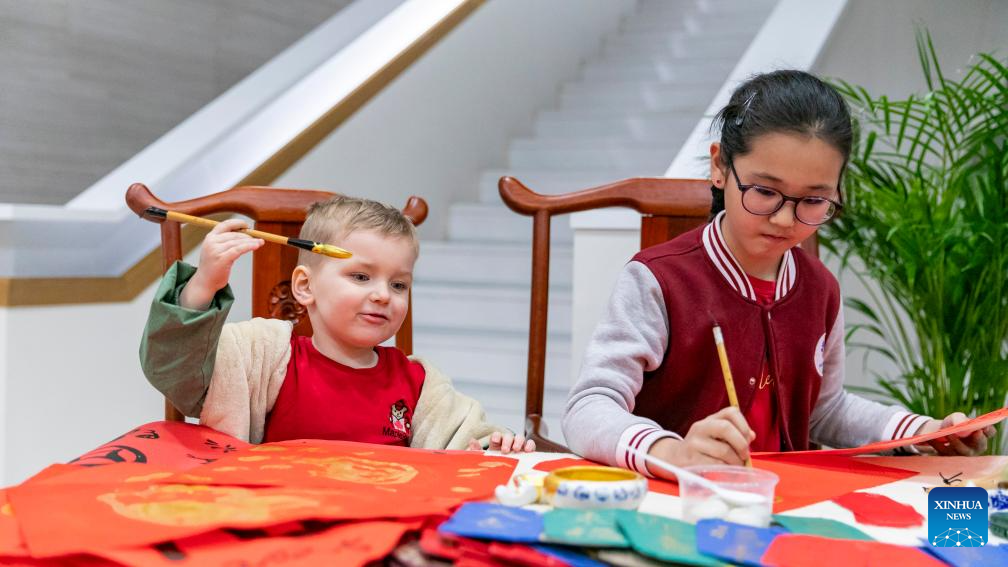 Two kids write Chinese character "Fu," which means good fortune, during an exhibition on the Chinese zodiac at the China Cultural Center in Belgrade, Serbia on Feb. 12, 2025. The China Cultural Center in Belgrade marked the end of Chinese Spring Festival festivities in Serbia on Wednesday with an exhibition on the Chinese zodiac and yuanxiao. Yuanxiao, glutinous rice flour dumpling, is the popular food for the Chinese traditional Lantern Festival, which falls on the 15th day of the first lunar month, or Feb. 12 this year. (Photo by Wang Wei/Xinhua)