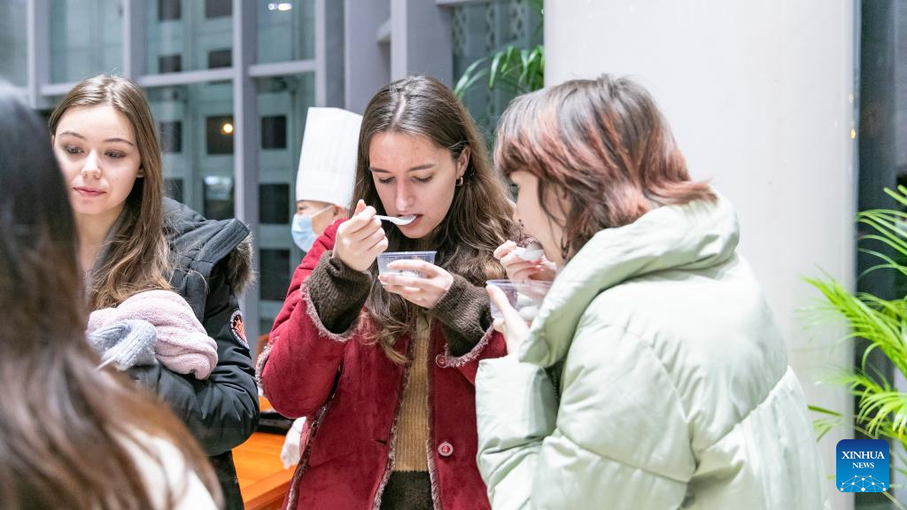 People taste yuanxiao during an exhibition on the Chinese zodiac at the China Cultural Center in Belgrade, Serbia on Feb. 12, 2025. The China Cultural Center in Belgrade marked the end of Chinese Spring Festival festivities in Serbia on Wednesday with an exhibition on the Chinese zodiac and yuanxiao. Yuanxiao, glutinous rice flour dumpling, is the popular food for the Chinese traditional Lantern Festival, which falls on the 15th day of the first lunar month, or Feb. 12 this year. (Photo by Wang Wei/Xinhua)
