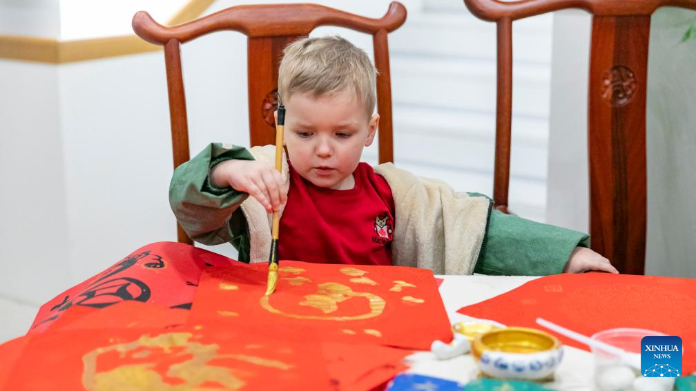 A kid writes Chinese character "Fu," which means good fortune, during an exhibition on the Chinese zodiac at the China Cultural Center in Belgrade, Serbia on Feb. 12, 2025. The China Cultural Center in Belgrade marked the end of Chinese Spring Festival festivities in Serbia on Wednesday with an exhibition on the Chinese zodiac and yuanxiao. Yuanxiao, glutinous rice flour dumpling, is the popular food for the Chinese traditional Lantern Festival, which falls on the 15th day of the first lunar month, or Feb. 12 this year. (Photo by Wang Wei/Xinhua)