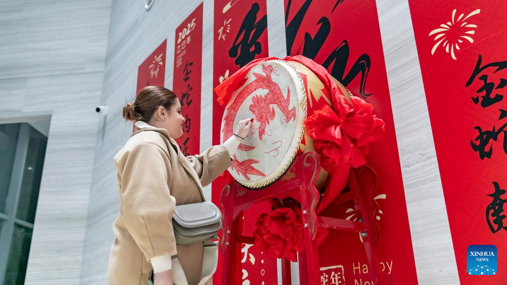 A woman beats a drum for good fortune during an exhibition on the Chinese zodiac at the China Cultural Center in Belgrade, Serbia on Feb. 12, 2025. The China Cultural Center in Belgrade marked the end of Chinese Spring Festival festivities in Serbia on Wednesday with an exhibition on the Chinese zodiac and yuanxiao. Yuanxiao, glutinous rice flour dumpling, is the popular food for the Chinese traditional Lantern Festival, which falls on the 15th day of the first lunar month, or Feb. 12 this year. (Photo by Wang Wei/Xinhua)