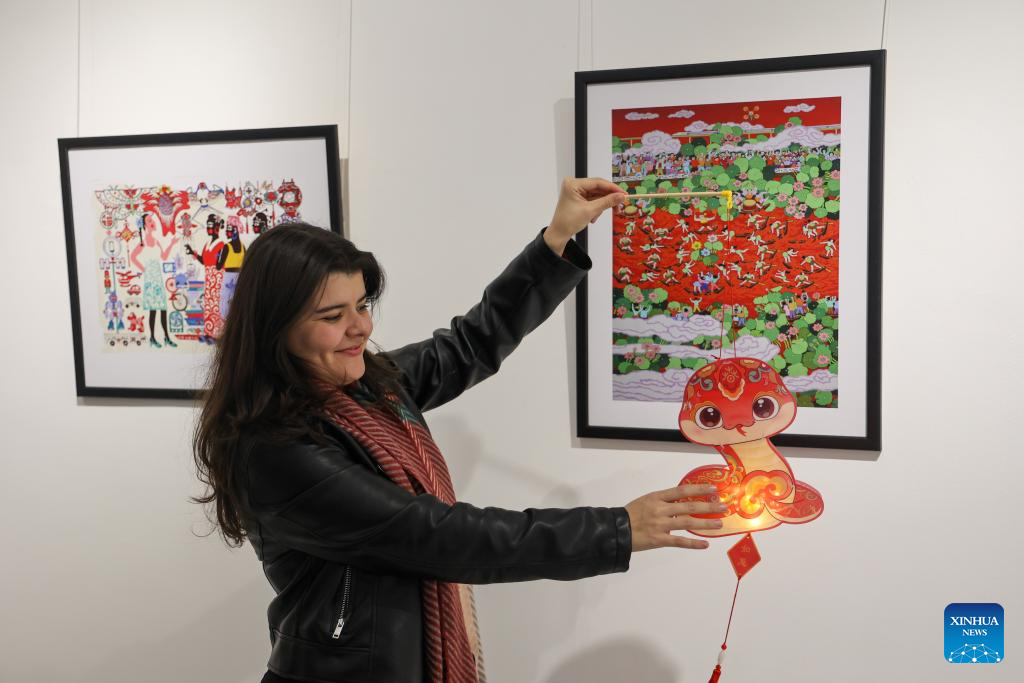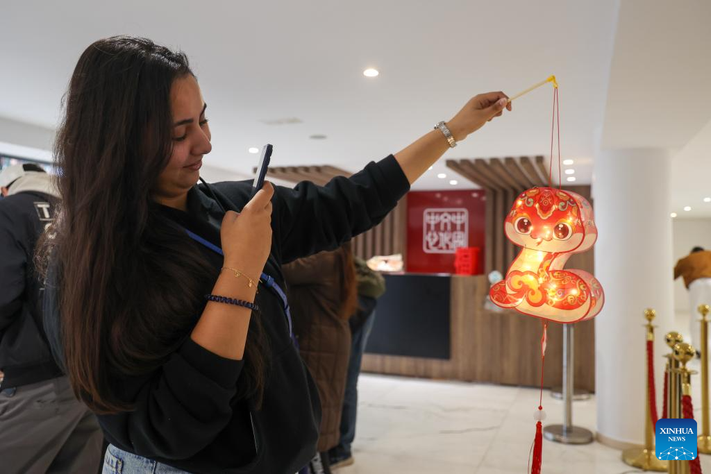 A Moroccan woman takes photos of a snake-shaped lantern at a Lantern Festival celebration event in Rabat, Morocco, on Feb. 12, 2025. (Xinhua/Huo Jing)