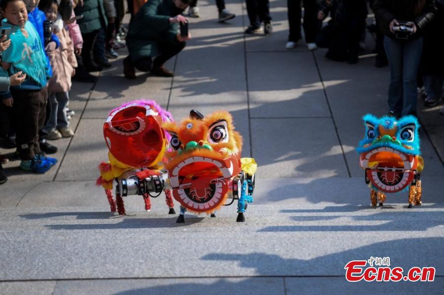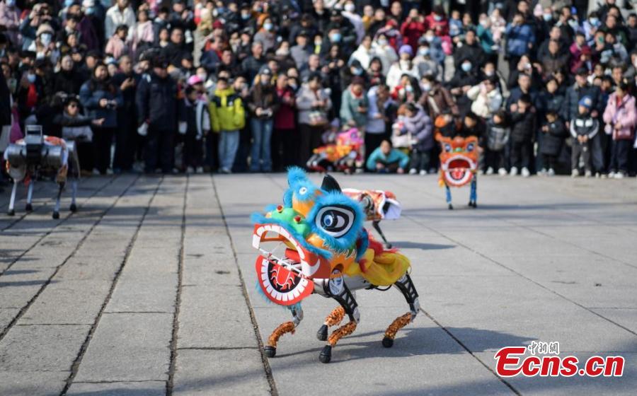 Robot dogs, with lion head-shaped decorations, perform dance alongside traditional lion dancers during a Lantern Festival celebration in Jinan, central China's Shandong Province, Feb. 12, 2025. (China News Service/Zhang Yong)
