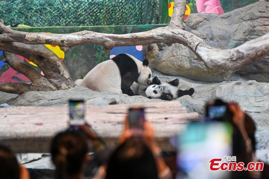 A giant panda cub nicknamed "Mei Zhu" plays with her mom at the Guangzhou Chimelong Safari Park in Guangzhou, south China's Guangdong Province, Feb. 12, 2025. (China News Service/Chen Jimin)