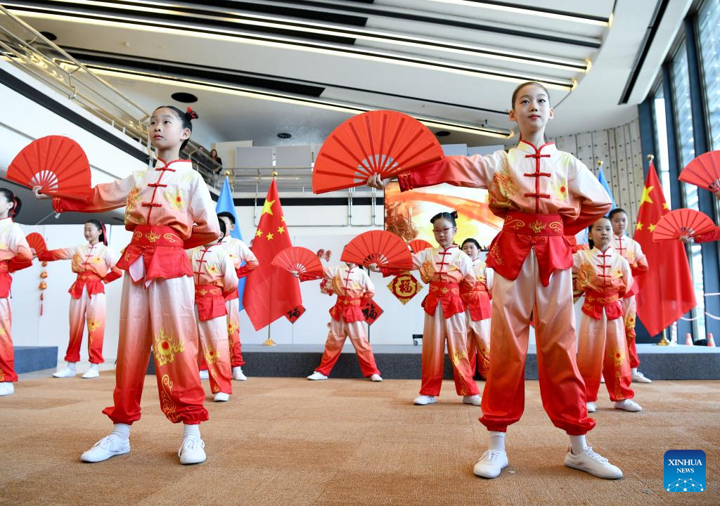 Children stage a Tai Chi fan performance during an event celebrating the Chinese Spring Festival at the Palais des Nations in Geneva, Switzerland, Feb. 12, 2025. This event featuring Tai Chi fan performances, paper-cutting, calligraphy, and lantern riddles was held here on Wednesday. It was organized by the Permanent Mission of China to the UN Office in Geneva and other international organizations in Switzerland. (Xinhua/Lian Yi)