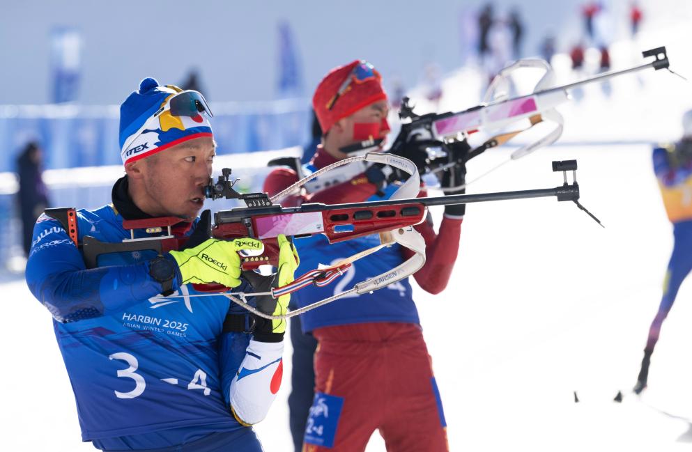 Tsukasa Kobonoki (front) of Japan competes during the biathlon men's 4x7.5km relay at the 9th Asian Winter Games in Yabuli, northeast China's Heilongjiang Province, Feb. 13, 2025. (Xinhua/Xie Jianfei)