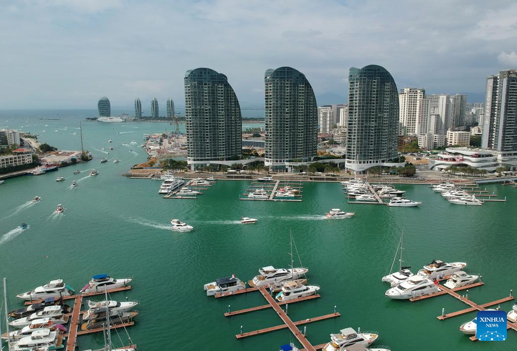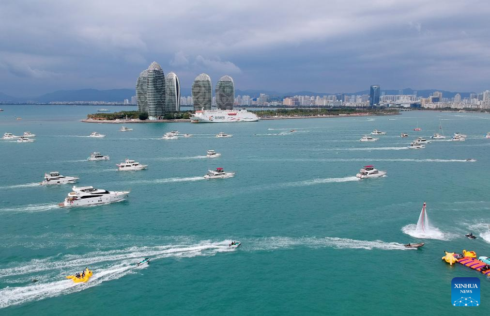 An aerial drone photo shows tourists taking yachts to have fun in Sanya, south China's Hainan Province, Feb. 13, 2025. The yacht tourism industry has recently seen a boom in Sanya of Hainan, with local maritime authorities implementing various measures to ensure safe travelling experiences of tourists on the sea. (Xinhua/Zhao Yingquan)