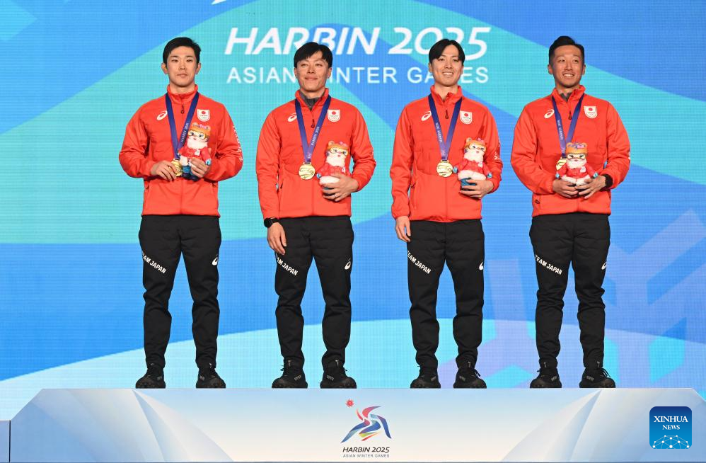Gold medalists Ojima Kiyomasa, Tachizaki Mikito, Yamamoto Masaharu and Kobonoki Tsukasa (L to R) of Japan attend the awarding ceremony for the biathlon men's 4x7.5km relay match at the 9th Asian Winter Games in Harbin, northeast China's Heilongjiang Province, Feb. 13, 2025. (Xinhua/Lian Zhen)