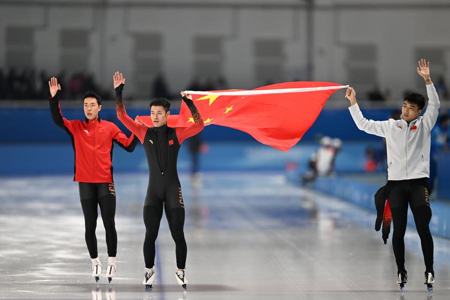Gao Tingyu (R), Lian Ziwen (L) and Ning Zhongyan celebrate after winning the speed skating men's team sprint gold at the 9th Asian Winter Games in Harbin, northeast China's Heilongjiang Province, Feb. 10, 2025. (Xinhua/Huang Bohan)