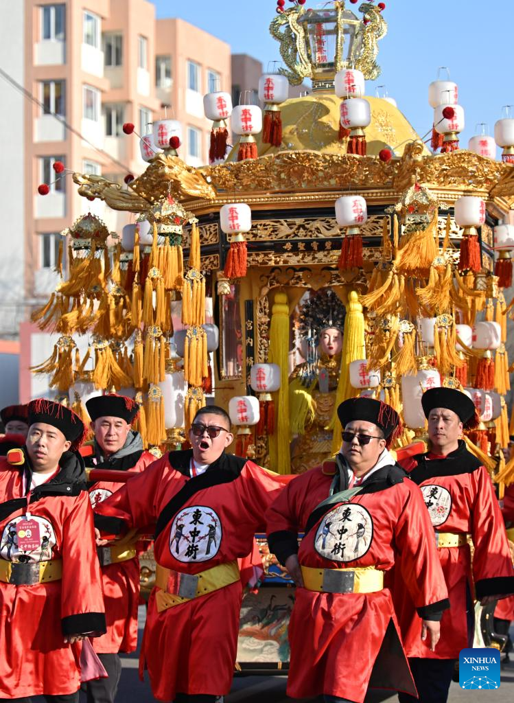 People perform during a memorial ceremony for Chinese sea goddess Mazu in north China's Tianjin Municipality, Feb. 13, 2025. Gegu Baonianhui, a memorial ceremony for Chinese sea goddess Mazu observed in Gegu Township, was staged on Thursday in Tianjin. This memorial ceremony was included in national intangible cultural heritage list in 2014. It is an important activity for the locals to celebrate the Chinese New Year and pray for good luck. (Xinhua/Li Ran)