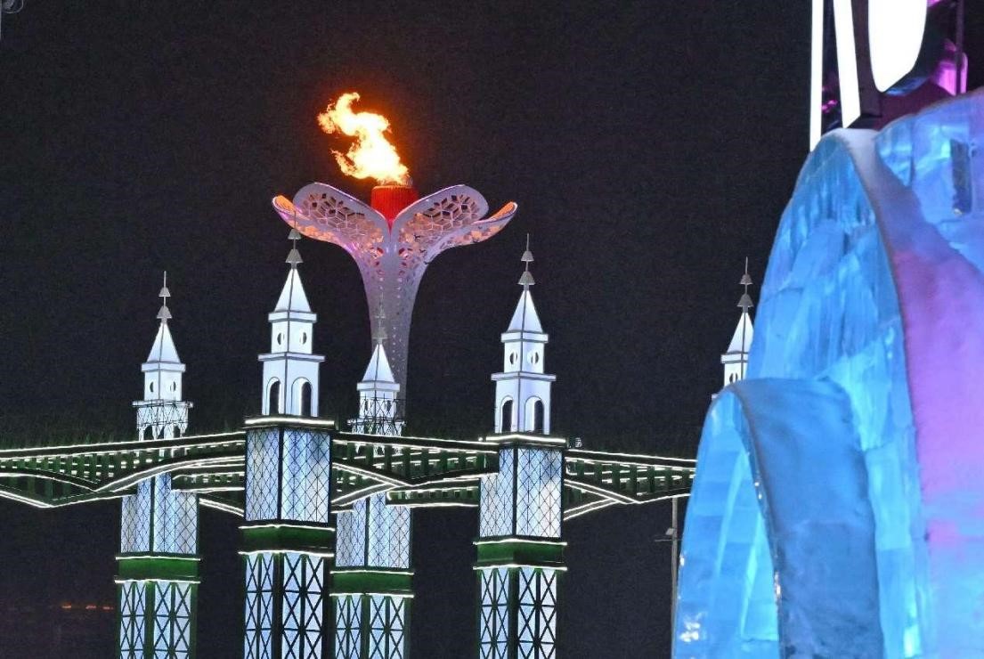 The main cauldron of the Harbin Asian Winter Games is lit, Feb. 7, 2025. (People's Daily Online/Hu Qingming)