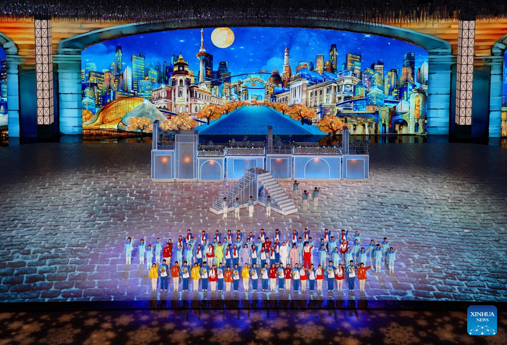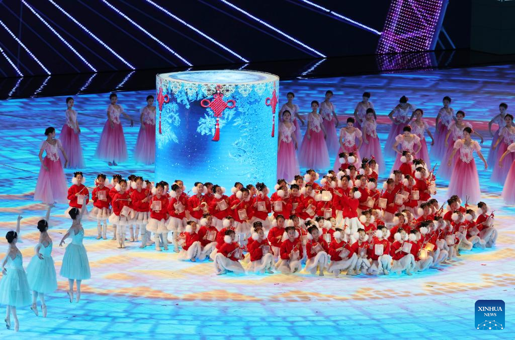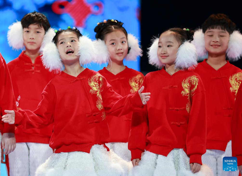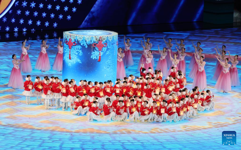 Children perform during the closing ceremony of the 9th Asian Winter Games in Harbin, northeast China's Heilongjiang Province, Feb. 14, 2025. (Xinhua/Xu Yanan)