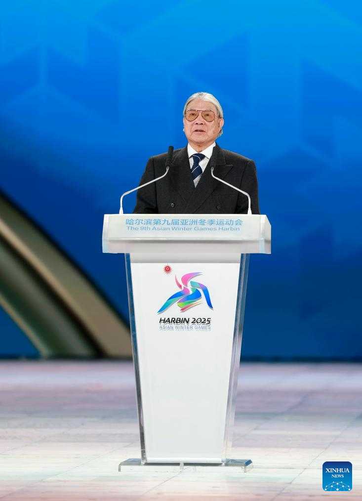 Timothy Fok Tsun-ting, first vice president of the Olympic Council of Asia (OCA), speaks during the closing ceremony of the 9th Asian Winter Games in Harbin, northeast China's Heilongjiang Province, Feb. 14, 2025. (Xinhua/Zhang Tao)